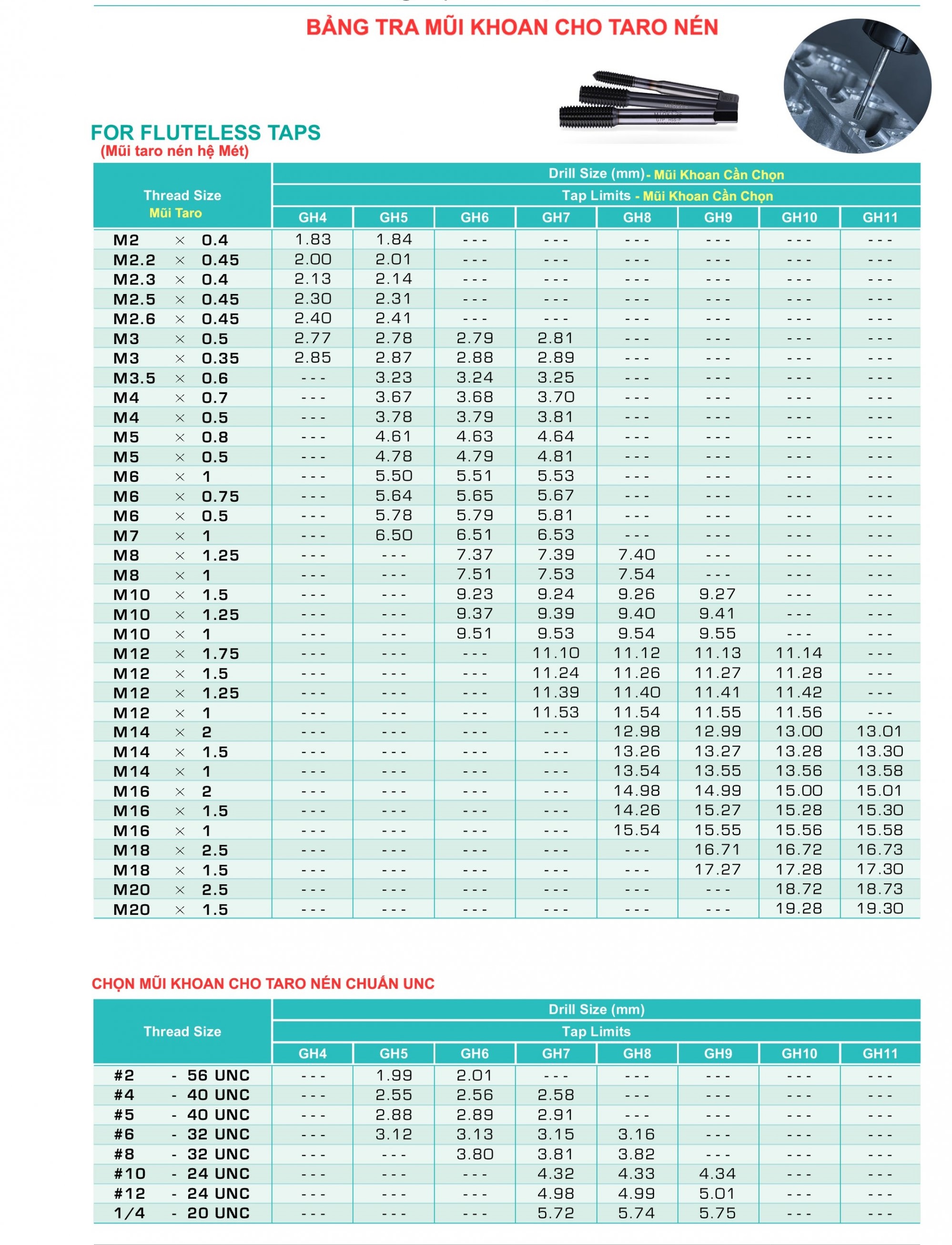 Bảng Tra Mũi Khoan Và Taro Nén Hệ Mét Và Hệ Inch Chuẩn Unc