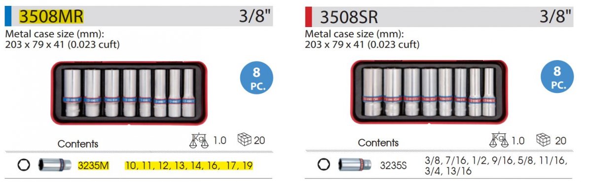 Quy cách: 3/8sq, Size: 10, 11, 12, 13, 14, 16, 17, 19