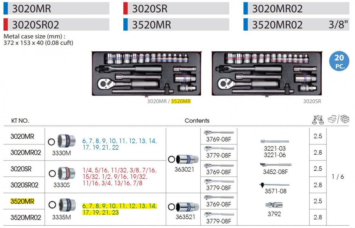 Quy cách: 3/8sq, Size: 6, 7, 8, 9, 10, 11, 12, 13, 14, 17, 19, 21, 23.