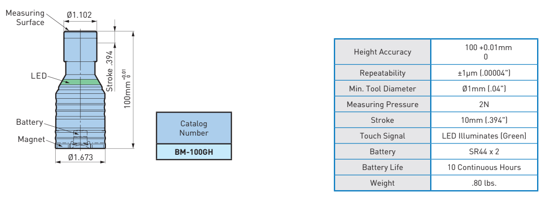 Base Master BM-100GH là cảm biến cảm ứng chính xác để xác định độ lệch phôi và chiều dài dao. Được gắn trên bề mặt phôi hoặc bàn máy, đèn LED chiếu sáng ngay lập tức khi lưỡi cắt chạm vào tấm cảm biến và vị trí được phát hiện.