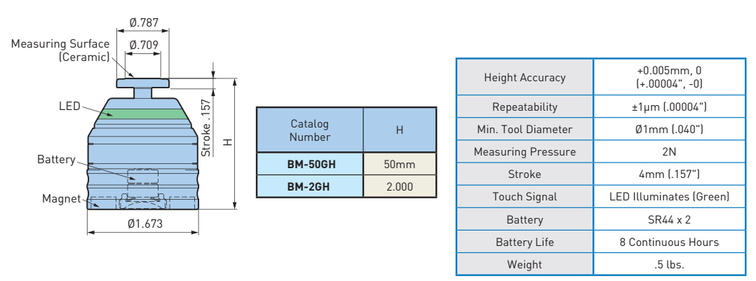 Base Master BM-50GH, BM-2GH là cảm biến cảm ứng chính xác để xác định độ lệch phôi và chiều dài dao. Được gắn trên bề mặt phôi hoặc bàn máy, đèn LED chiếu sáng ngay lập tức khi lưỡi cắt chạm vào tấm cảm biến và vị trí được phát hiện.