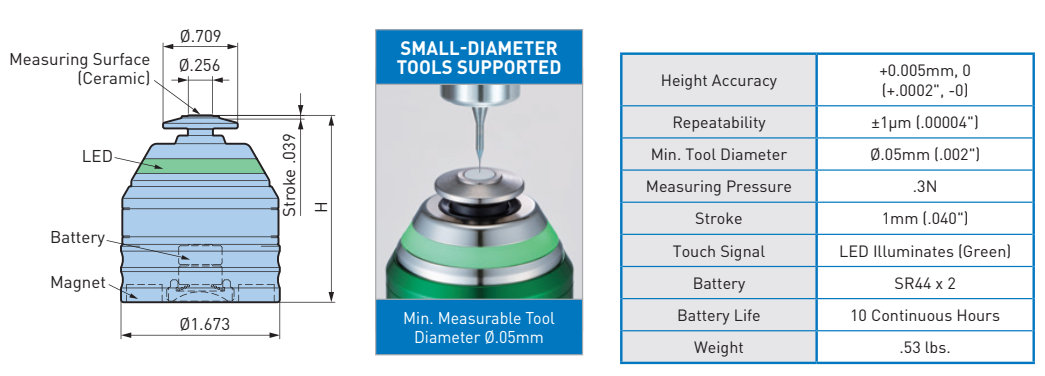 Base Master BM-50MH, BM-2MH là cảm biến cảm ứng chính xác được thiết kế đặc biệt cho các dụng cụ cắt siêu nhỏ. Áp suất đo thấp giúp bảo vệ lưỡi cắt.