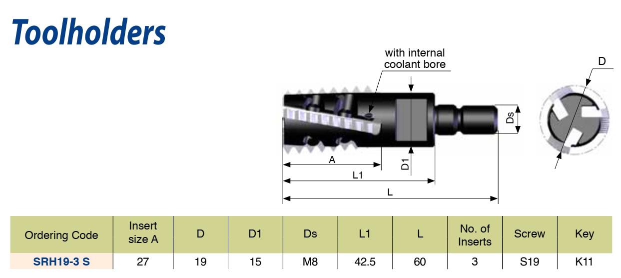 - Cán dao phay ren lỗ sâu CPT SRH19-3 S lý tưởng cho các ứng dụng phay ren lỗ sâu mà các loại cán dao thông thường không gia công tới.