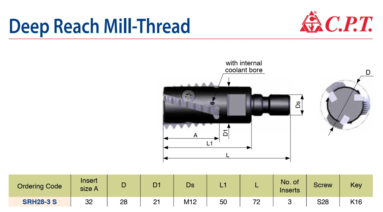- Cán dao phay ren lỗ sâu CPT SRH28-3 S lý tưởng cho các ứng dụng phay ren lỗ sâu mà các loại cán dao thông thường không gia công tới.