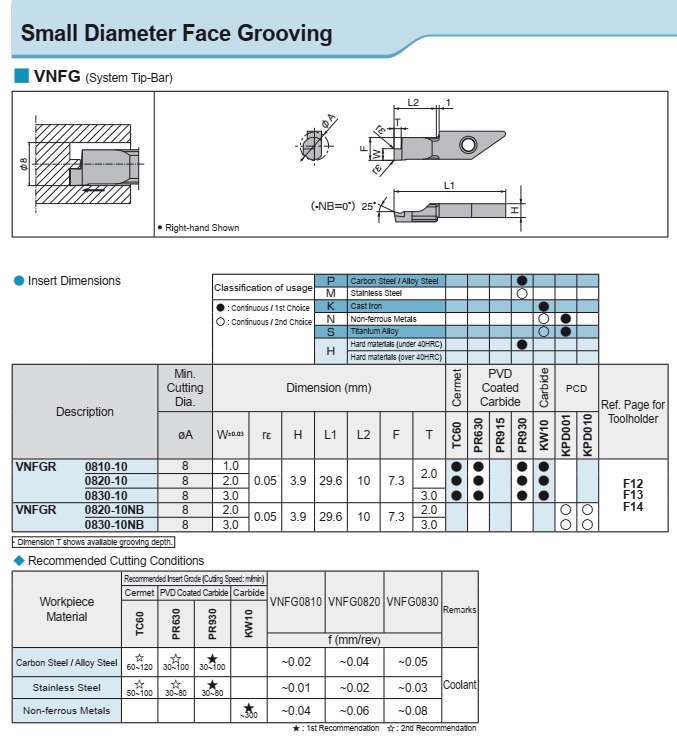 Sản phẩm dao tiện rãnh mặt đầu Kyocera VNFG chuyên ứng dụng gia công cho các chi tiết có đường kính lớn (𝜙8) và đòi hỏi độ chính xác cao. Dao tiện rãnh mặt đầu Kyocera VNFG sử dụng lắp ống dao System Tip-Bars. Để hiểu rõ hơn về ống dao System Tip-Bars mời bạn đọc tham khảo thêm Catalog: