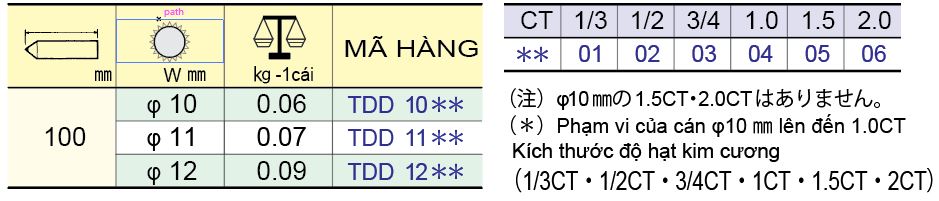 | TDD1201 | Ø12 | Cây sửa đá 12mm TDD1201 - Độ hạt kim cương: 1/3 | Liên hệ |