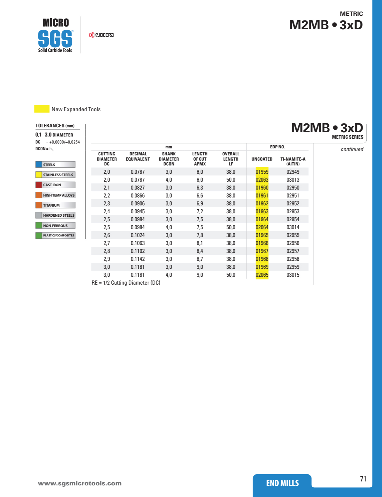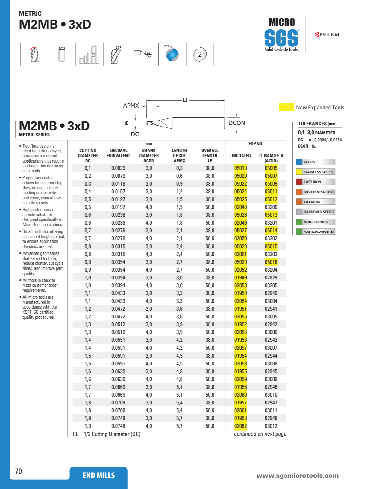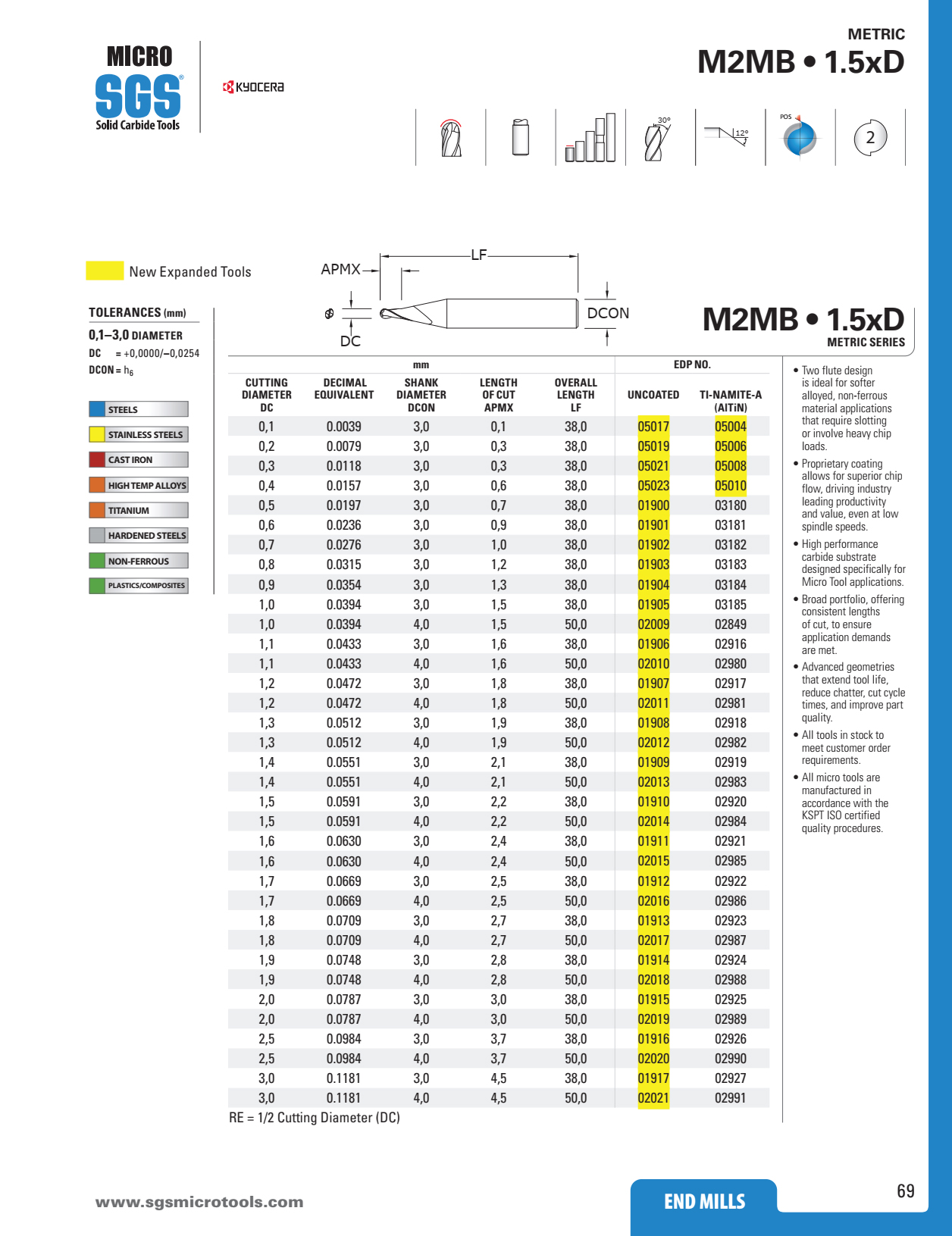 Dòng sản phẩm Dao Phay Cầu Hợp Kim 2 me Kyocera SGS M2MB thương hiệu Kyocera SGS từ Mỹ với các tính năng: