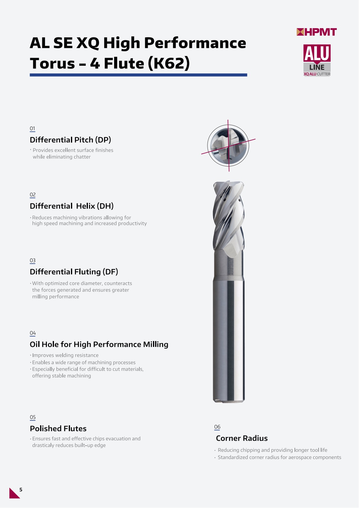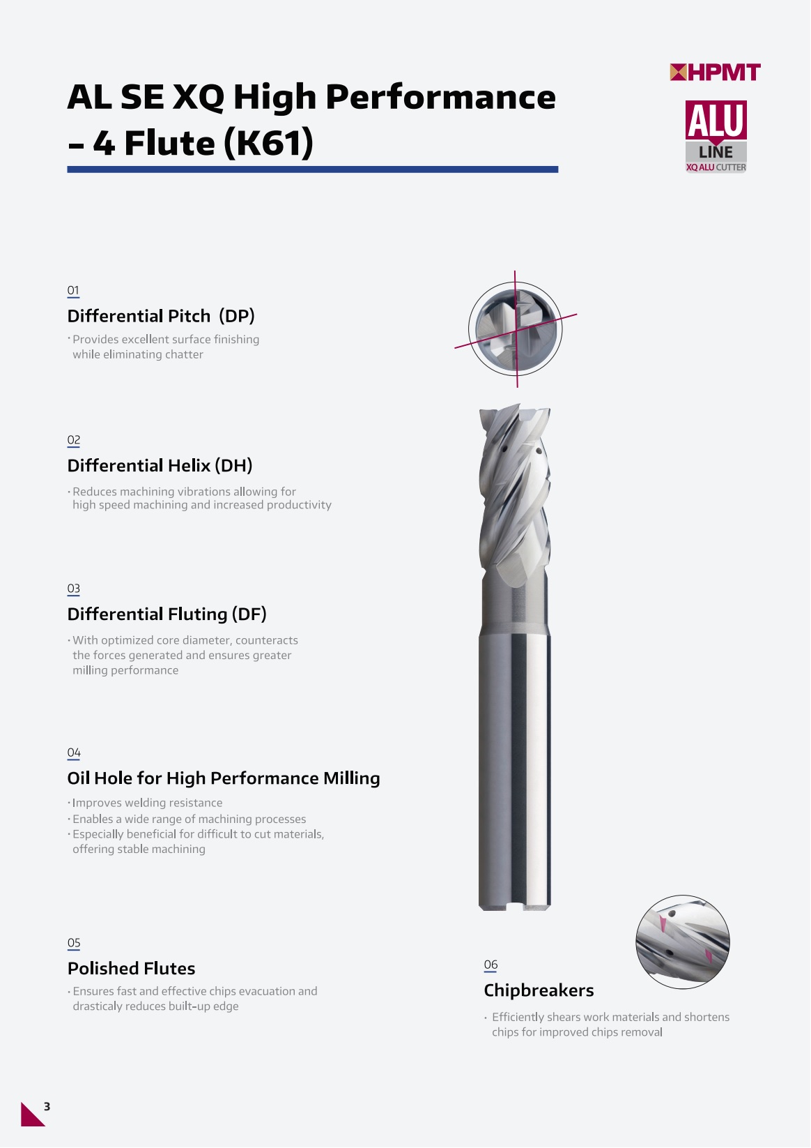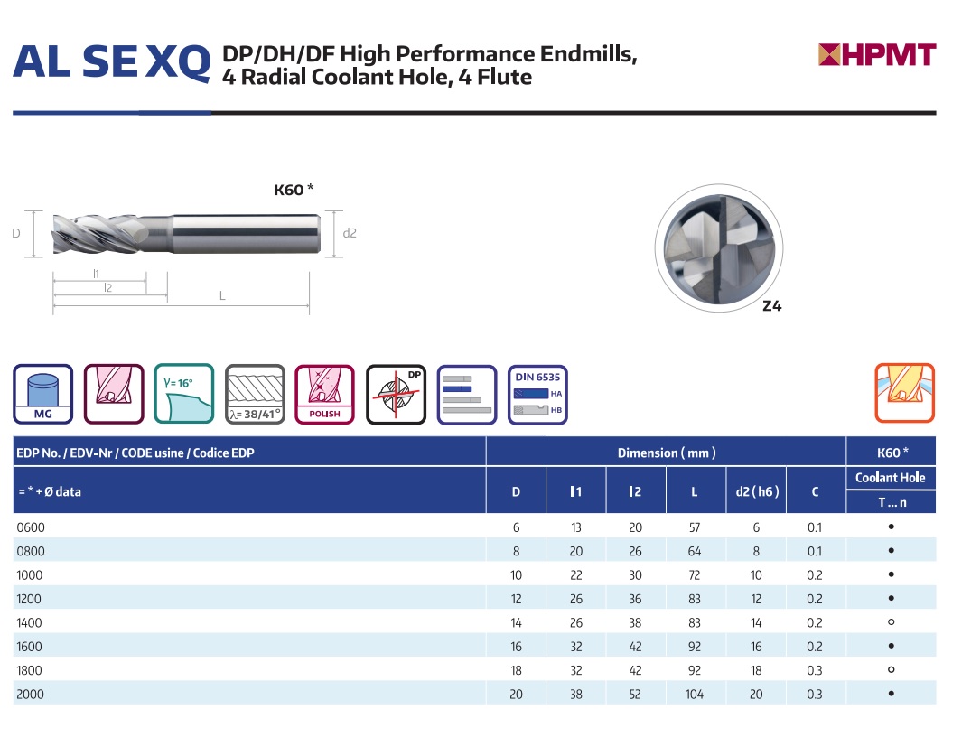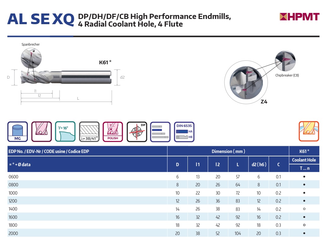 Al SE XQ là một phần của Dây chuyền Alu của HPMT dùng để phay nhôm hiệu suất cao. Nó nhanh, bền và linh hoạt cho mọi ứng dụng. Dao phay trụ Al SE XQ có nhiều bán kính khác nhau với số EDP là K60, K61, K62 & K63.