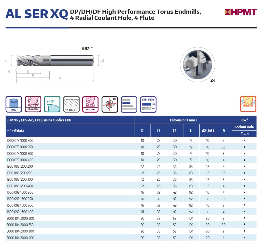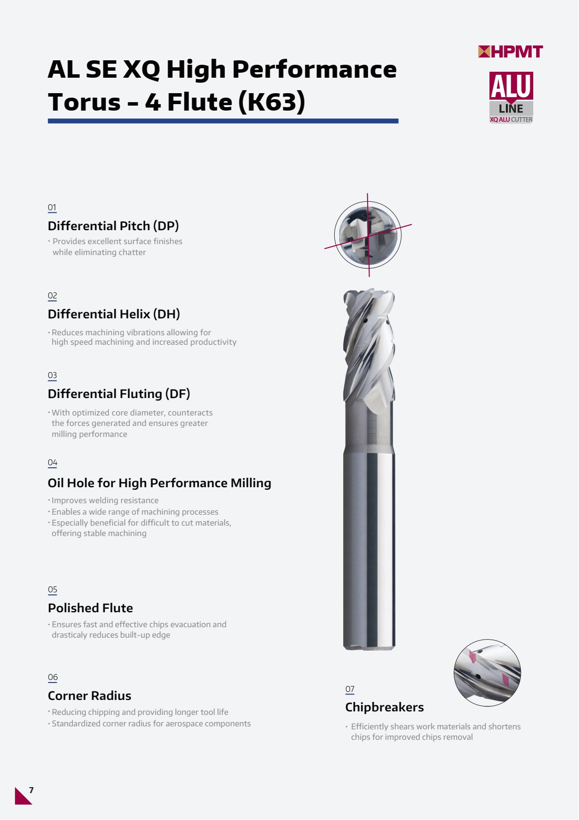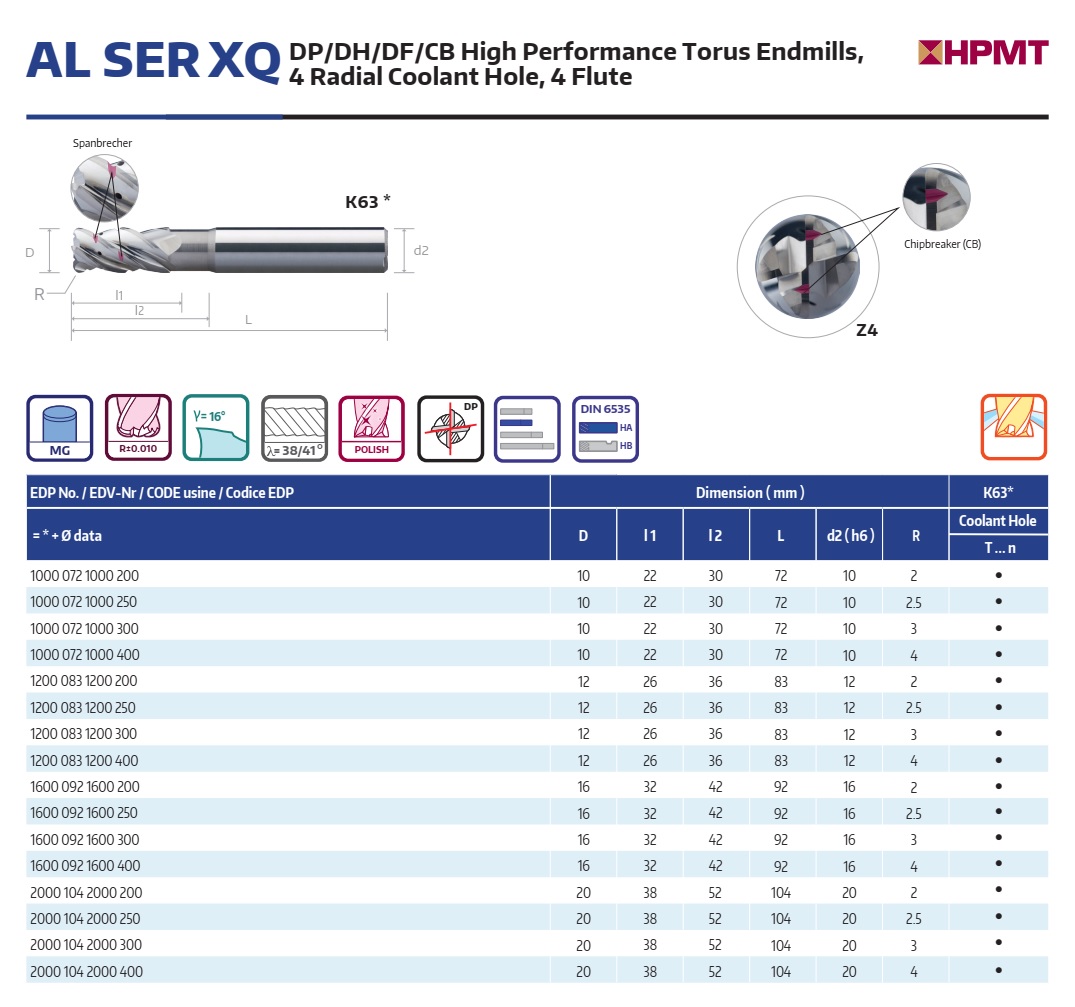 Al SE XQ là một phần của Dây chuyền Alu của HPMT dùng để phay nhôm hiệu suất cao. Nó nhanh, bền và linh hoạt cho mọi ứng dụng. Dao phay trụ Al SE XQ có nhiều bán kính khác nhau với số EDP là K60, K61, K62 & K63.