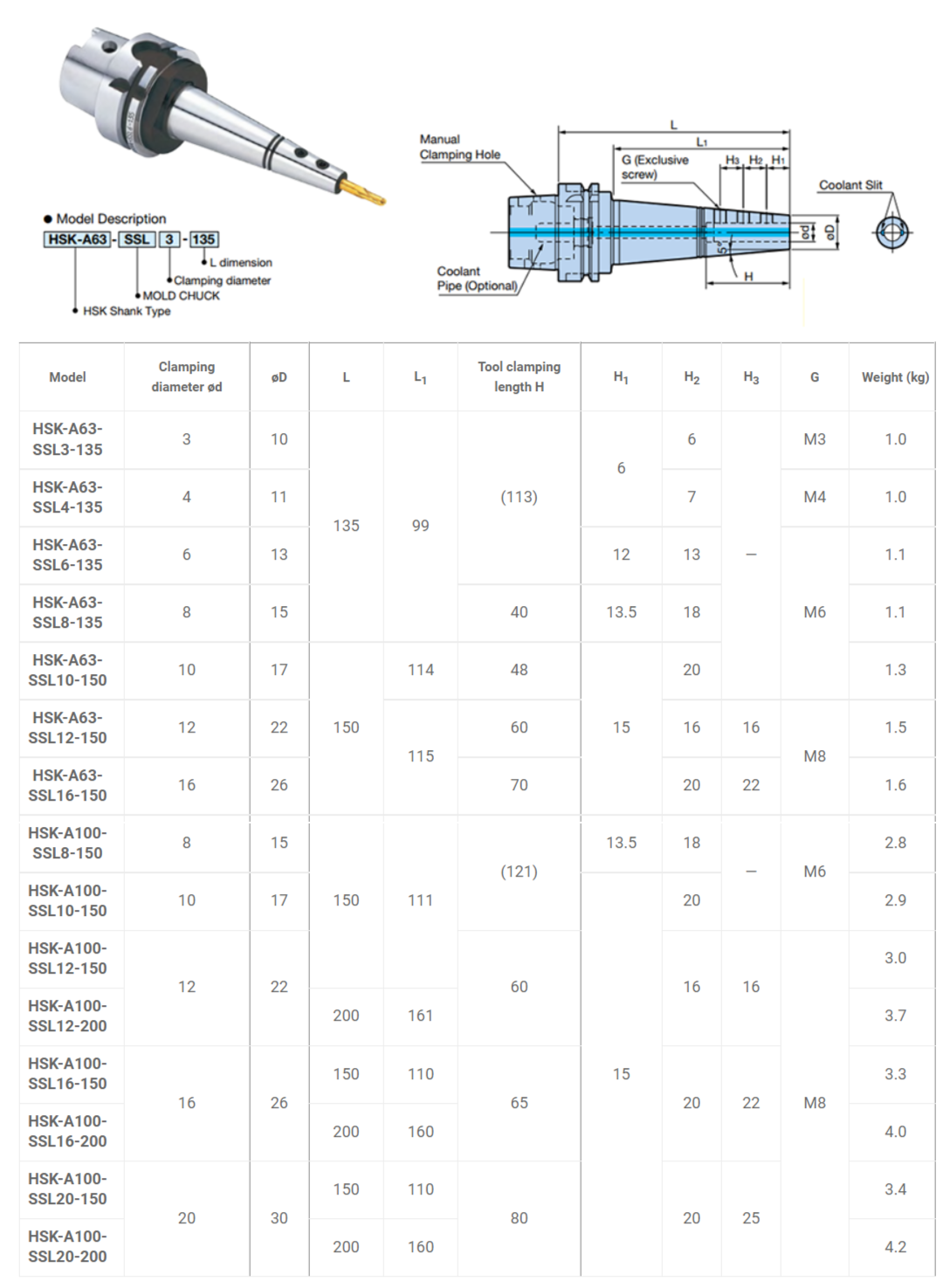 HSK-A63-SSL3-135, HSK-A63-SSL4-135, HSK-A63-SSL6-135, HSK-A63-SSL8-135, HSK-A63-SSL10-150, HSK-A63-SSL12-150, HSK-A63-SSL16-150, HSK-A100-SSL8-150, HSK-A100-SSL10-150, HSK-A100-SSL12-150, HSK-A100-SSL12-200, HSK-A100-SSL16-150, HSK-A100-SSL16-200, HSK-A100-SSL20-150, HSK-A100-SSL20-200.