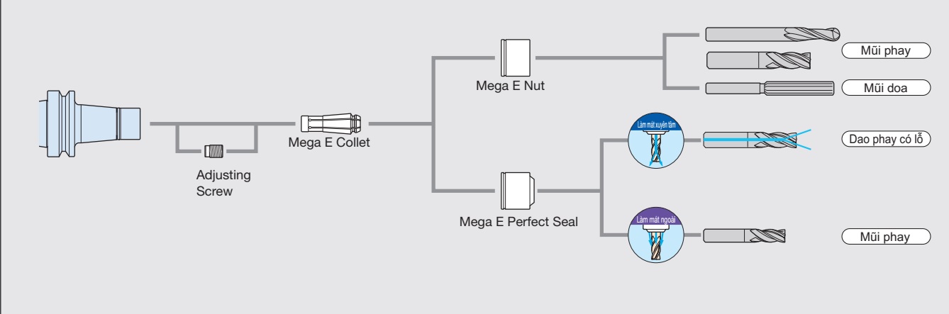 Đầu kẹp Mega E Chuck là dòng đầu kẹp dao phay tốc độ cao và độ cứng vững cao dùng cho dao phay thô và tinh.