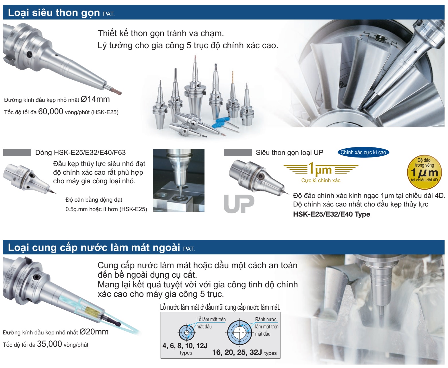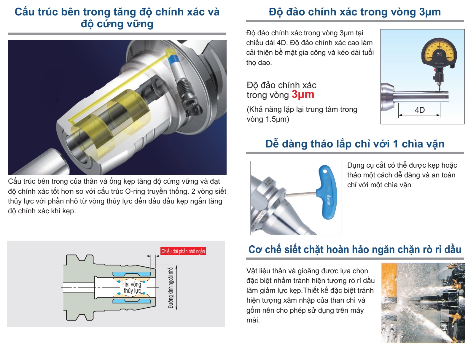 Đầu kẹp thủy lực Hydraulic Chuck BBT/BT Shank là loại đầu kẹp cung cấp độ đảo chính xác cho máy khi phay, khoan và doa lỗ. Tăng cường dải đường kính kẹp và đa dạng về chiều dài.