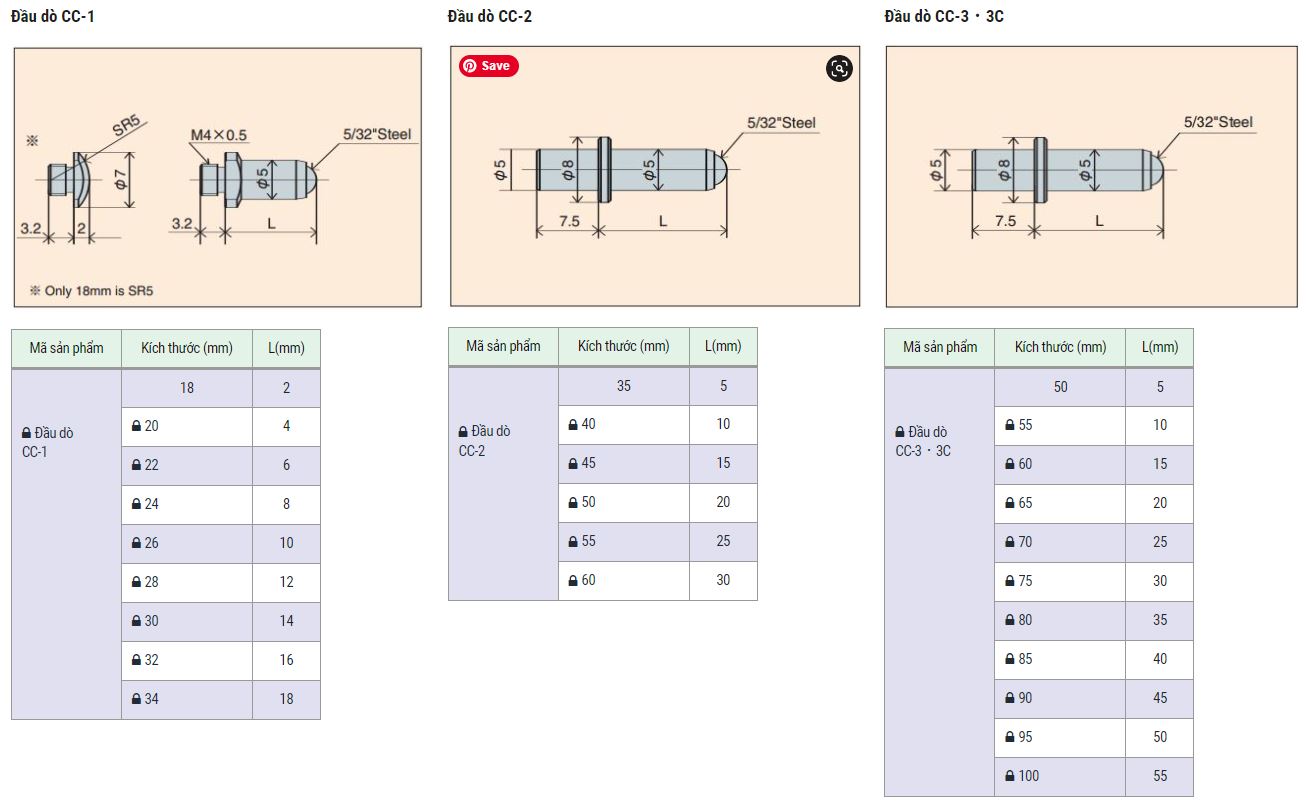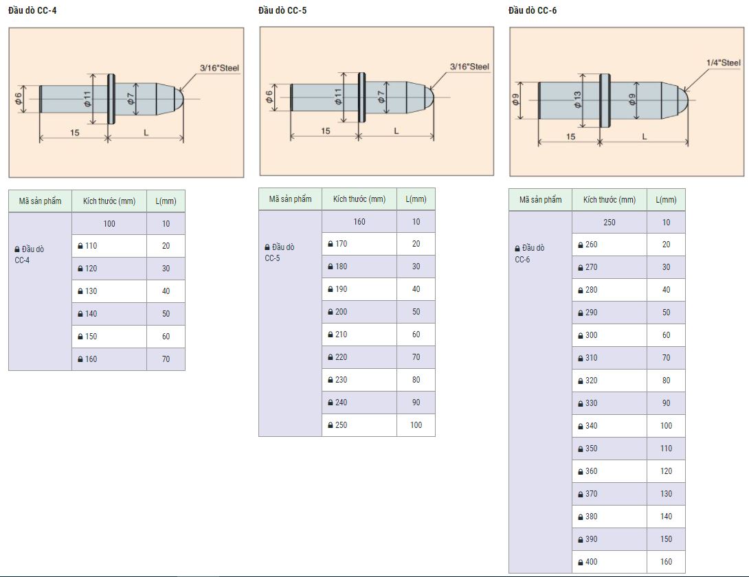 | Mã sản phẩm | Dải đo (mm) | Length below grip (mm) | Số lượng đầu dò (mm) | Độ dày vòng đệm (mm) | Giá bán |