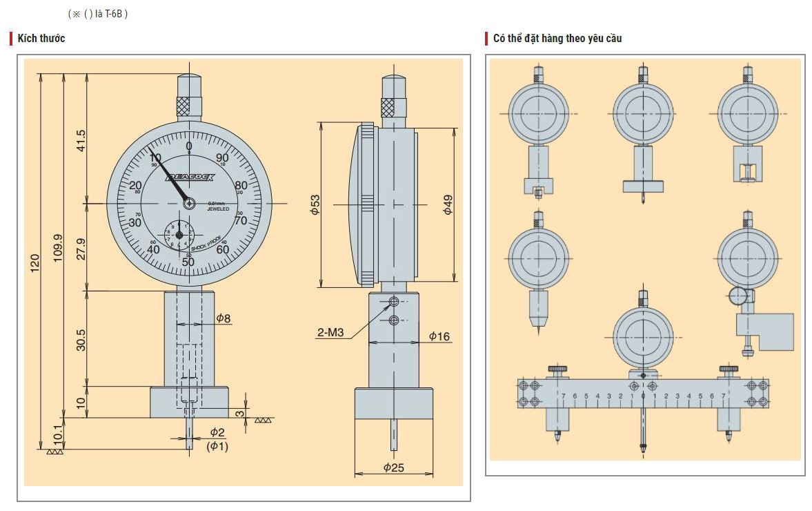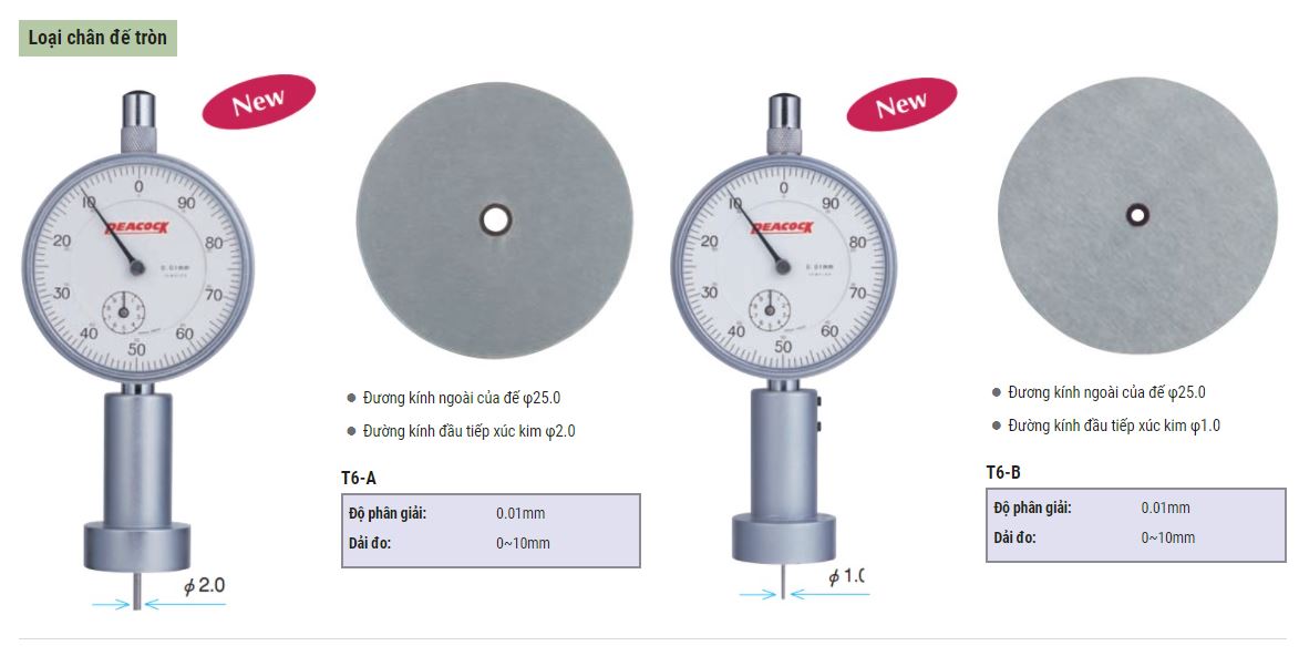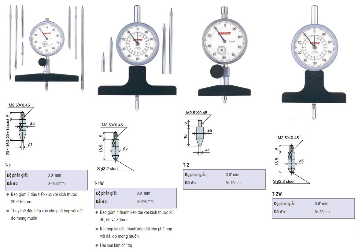Đồng hồ đo sâu Peacock dòng T sử dụng để đo độ sâu các loại lỗ, rãnh, bậc.... Đồng hồ đo lỗ cho kết quả đo chính xác cao với lực đo phù hợp.