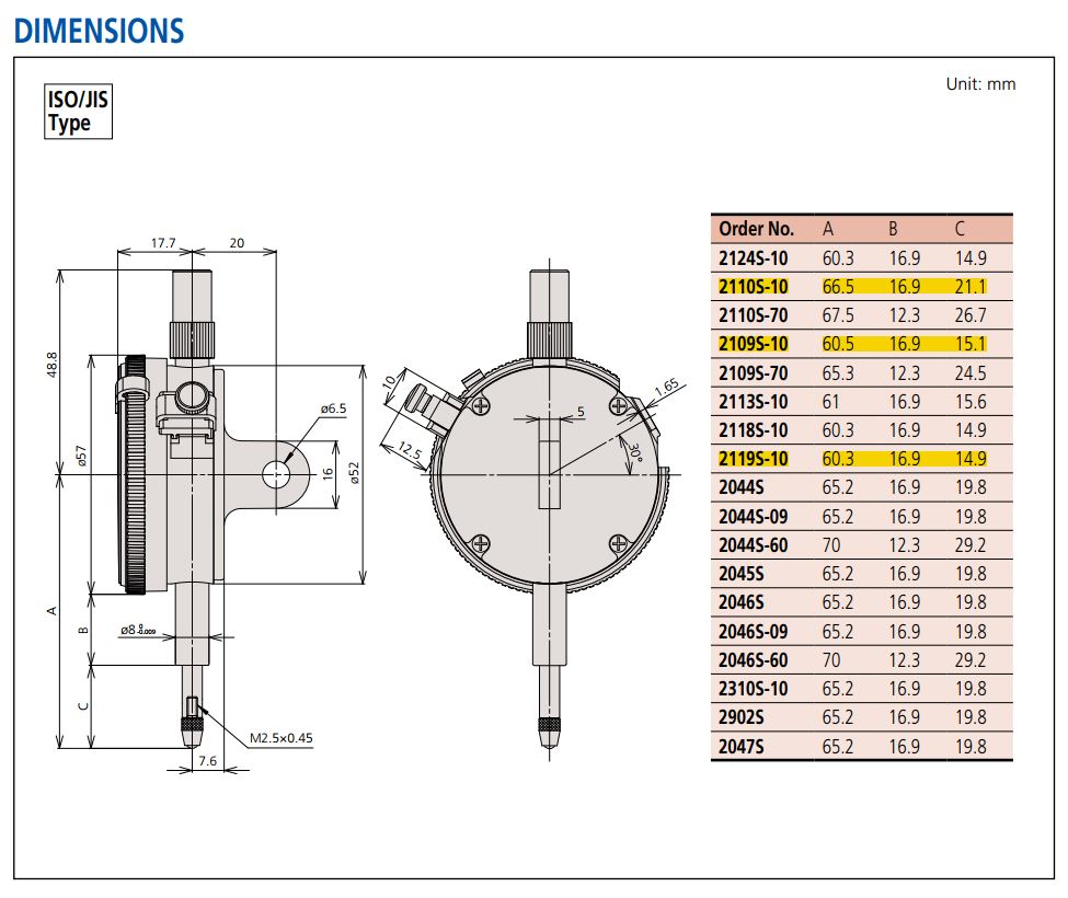 Thông số kỹ thuật Đồng hồ so cơ khí Mitutoyo 2110S-10
