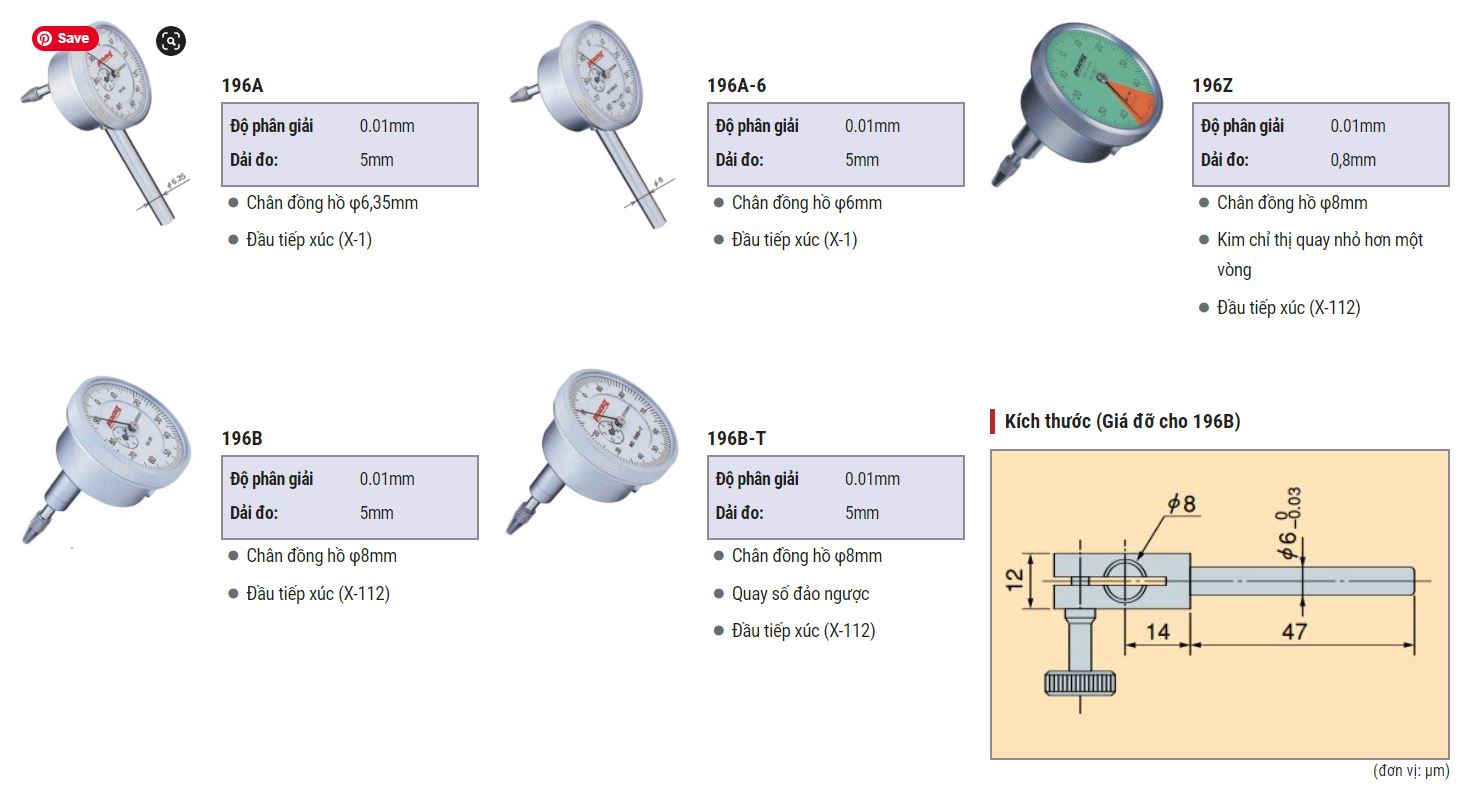 | Mã sản phẩm | Độ phân giải (mm) | Dải đo (mm) | Vạch chia | Sai số hiển thị | Sai số đường hồi | Độ lặp lại | Lực đo | ||||