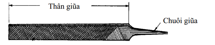 Thân dũa: có chiều dài gấp 3 – 4 lần chiều dài chuôi. Thân thường có tiết diện dẹt, vuông, tròn, tam giác, …với các kích thước khác nhau tùy theo kích thước và hình dạng của chi tiết gia công.