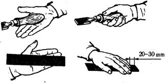 + Tay thuận cầm cán dũa bằng cả bàn tay và 5 ngón tay, và phần chuôi cầu của cán dũa đặt vào phần lõm giữa bàn tay.