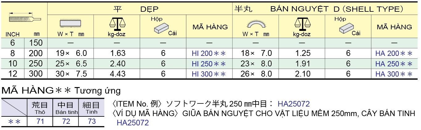 | HA25072 | Bán Tinh | 250mm x 23mm × 8mm | Dũa HA25072 Tsubosan Để Bẻ Phoi Nhựa, Thạch Cao, Cao Su Cứng | Liên hệ |