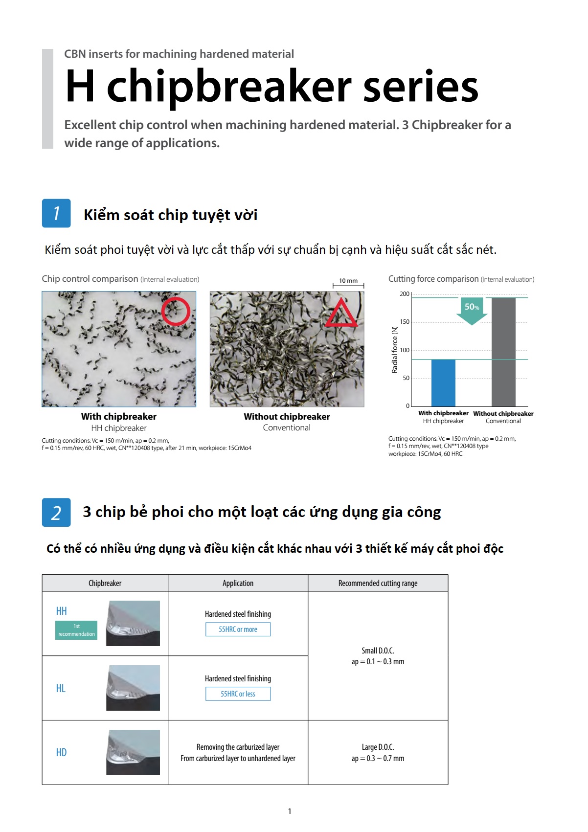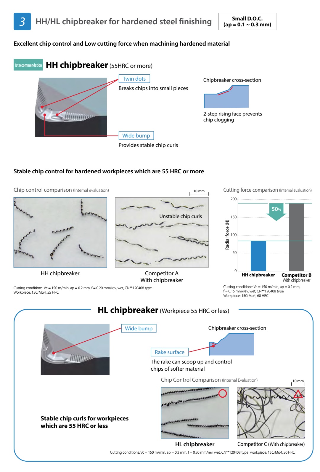 - Chipbreaker HH: phù hợp gia công tinh với D.O.C nhỏ cho vật liệu độ cứng từ 55Hrc trở lên (ưu tiên hàng đầu)