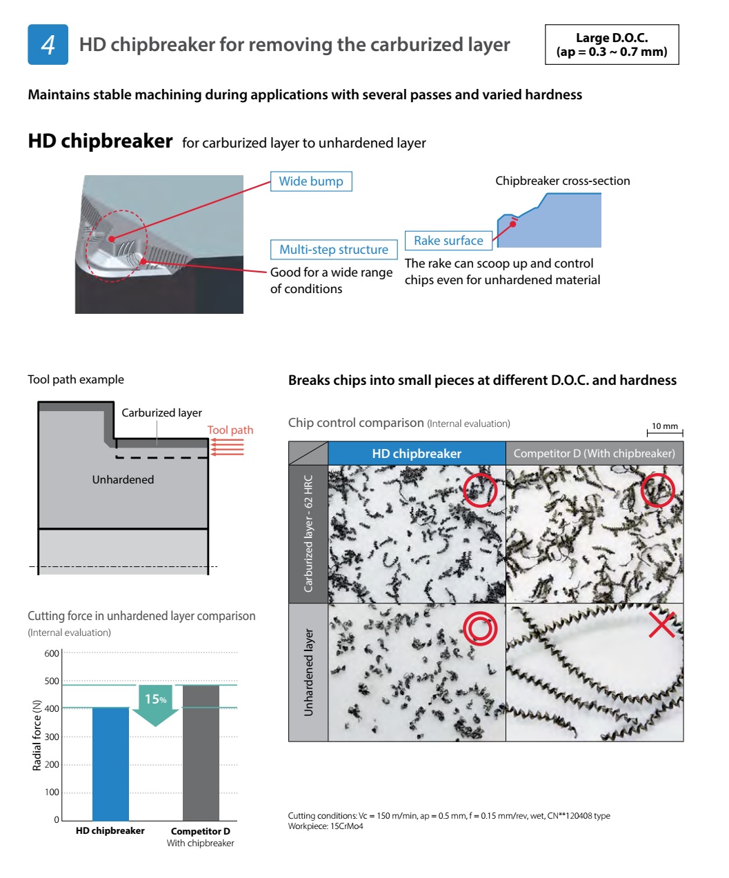 - Chipbreaker HD: ứng dụng gia công với D.O.C lớn giúp loại bỏ nhanh vật liệu ở lớp cacbon hóa trên cùng