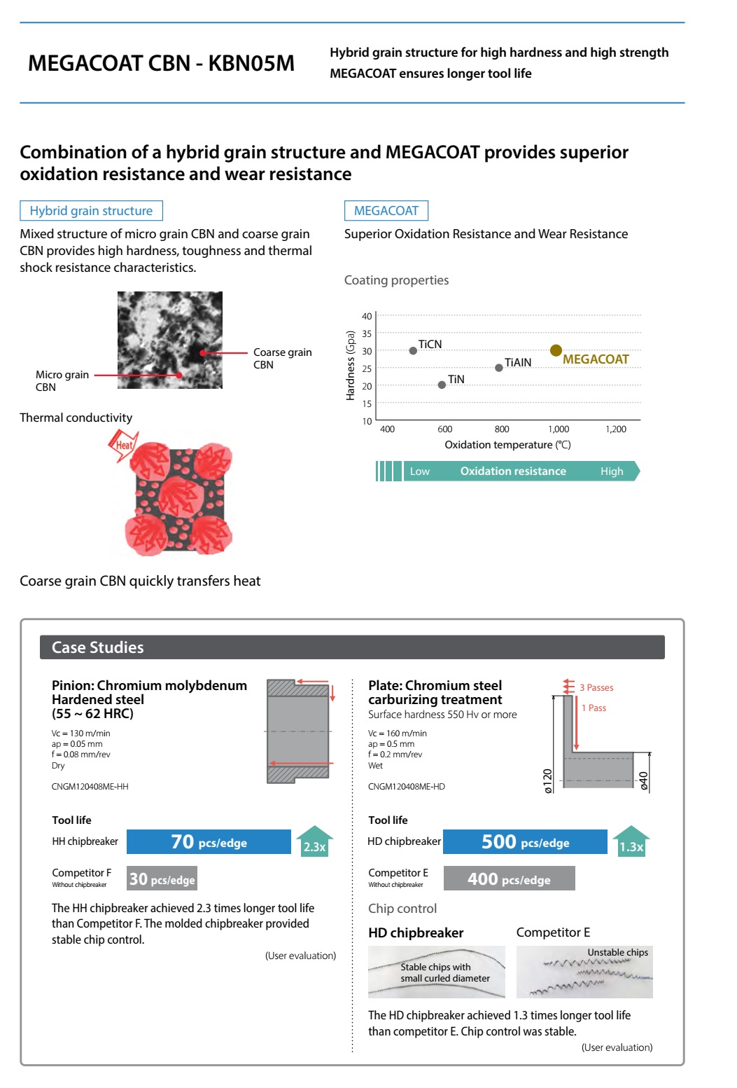 Ngoài ra, lớp phủ dành riêng cho Insert CBN KBN025M được Kyocera nghiên cứu phát triển kết hợp cấu trúc hạt lai và MEGACOAT mang đến sự vượt trội, gia tăng khả năng chịu nhiệt lên đến hơn 1000°C giúp chống oxy hóa và chống mài mòn, kéo dài tuổi thọ dao tiện.