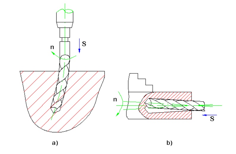 - Sử dụng sơ đồ khoan cho chi tiết quay, dao tịnh tiến (Như sơ đồ khoan trên máy tiện). Sơ đồ này đặc biệt phát huy hiệu quả khi khoan lỗ sâu.