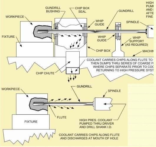 Khi gia công lỗ sâu (1/d>5) bằng mũi khoan ruột gà sẽ gặp nhiều khó khăn như độ cứng vững mũi khoan thấp, tính chất dẫn hướng kém, khó dẫn dung dịch trơn nguội vào vùng cắt, khó thoát phoi, khó thoát tản nhiệt,.. Vì vậy mũi khoan dễ bị gẫy, độ chính xác thấp, năng suất thấp. Để khác phục thường dùng các biện pháp sau: