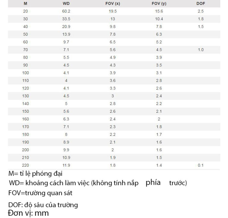 Khoảng cách làm việc / trường nhìn / độ sâu trường ảnh: