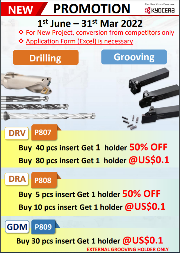3. Giảm 50% hoặc nhận miễn phí cán dao KHOAN DRV, DRA và cán dao TIỆN RÃNH GDM khi mua số lượng mảnh phay/tiện nhất định.