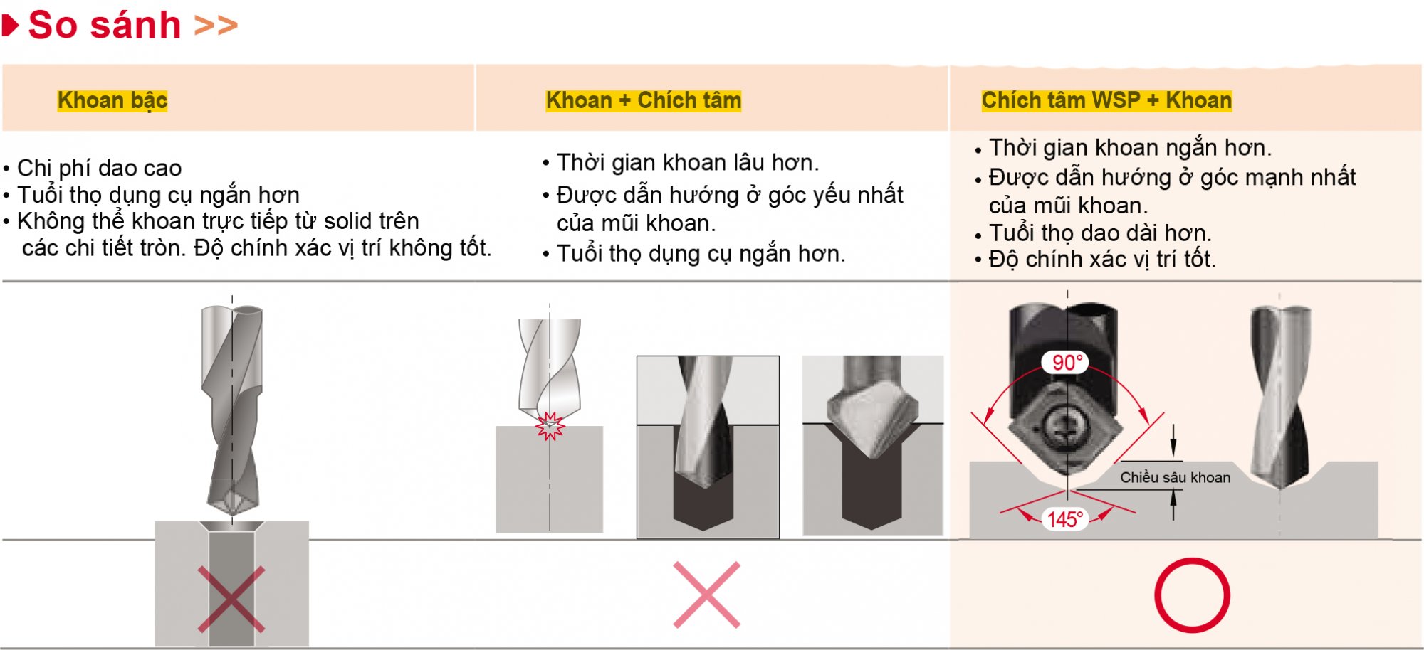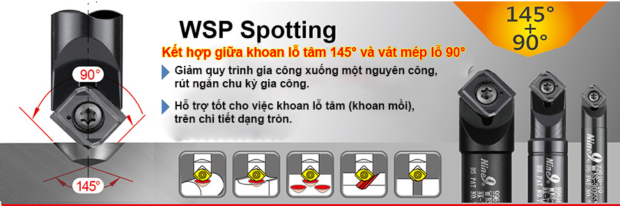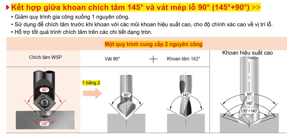 (3) chích tâm WSP + Khoan: Chích tâm và vát mép lỗ đồng thời => Khoan lỗ (2 nguyên công)