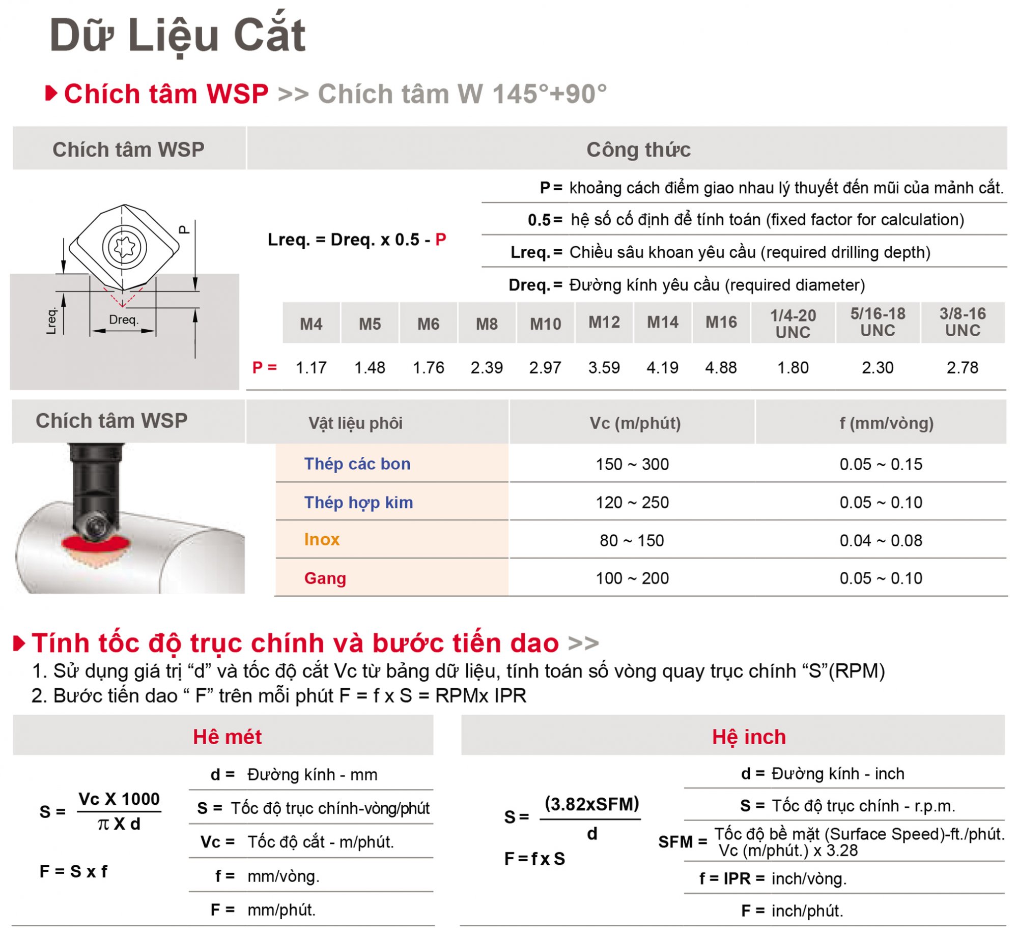Ví dụ: Cần chích tâm/khoan mồi và vát mép cho lỗ taro M6, sử dụng mũi khoan hiệu suất cao góc 135°