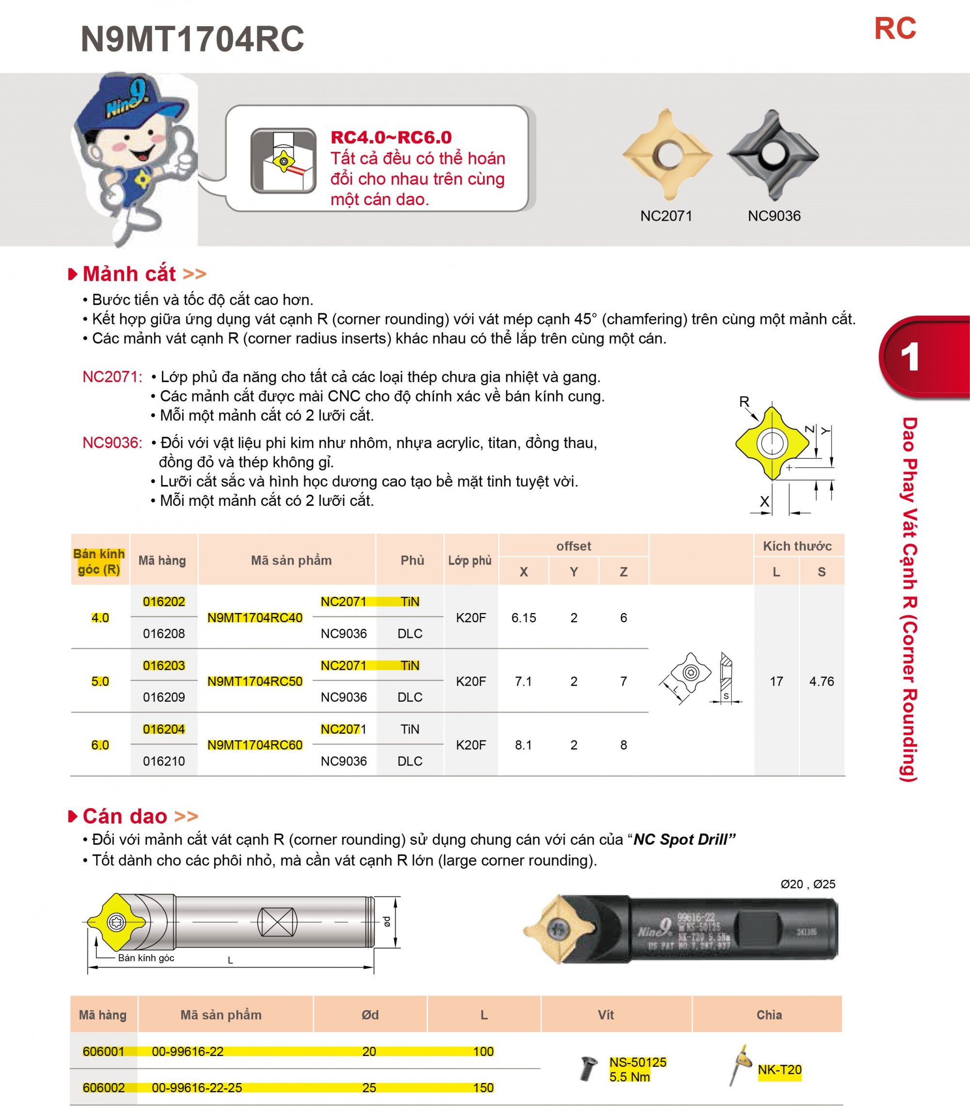 Mảnh Dao Bo Cung R6 Và Vát Cạnh 45 Độ, Nine9 N9MT1704RC60-NC2071