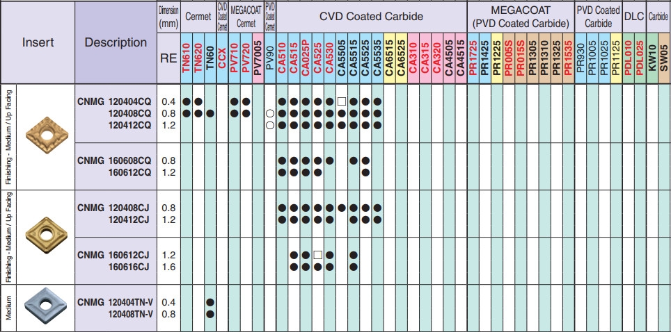 CNMG120408CQ-CA510, CNMG120408GP-CA510, CNMG120404XP-CA510, CNMG120408GP-CA515, CNMG120412PP-CA515, CNMG120412PG-CA515, CNMG120402PP-CA525, CNMG120404PS-PV7025, CNMG120408XP-PV7025, CNMG120408PS-PR1125, CNMG120408MS-PR1325
