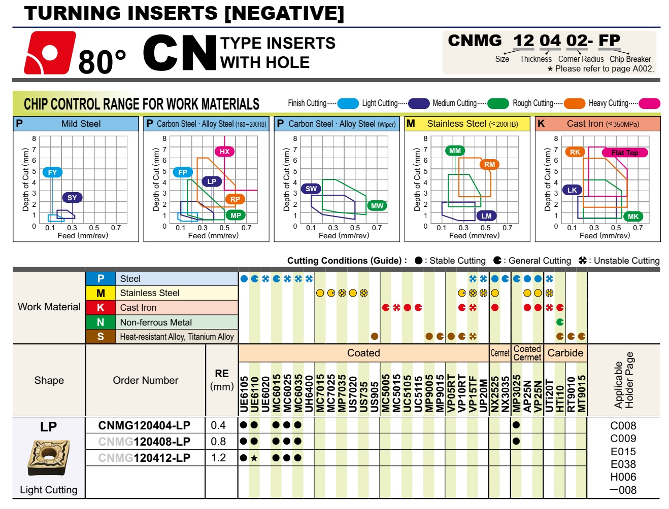 CNMG120404-LP UE6105, CNMG120404-LP UE6110, CNMG120404-LP MC6015, CNMG120404-LP MC6025, CNMG120404-LP MC6035, CNMG120404-LP MP3025, CNMG120408-LP UE6105, CNMG120408-LP UE6110, CNMG120408-LP MC6015, CNMG120408-LP MC6025, CNMG120408-LP MC6035, CNMG120408-LP MP3025, CNMG120412-LP UE6105, CNMG120412-LP UE6110, CNMG120412-LP MC6015, CNMG120412-LP MC6025, CNMG120412-LP MC6035.