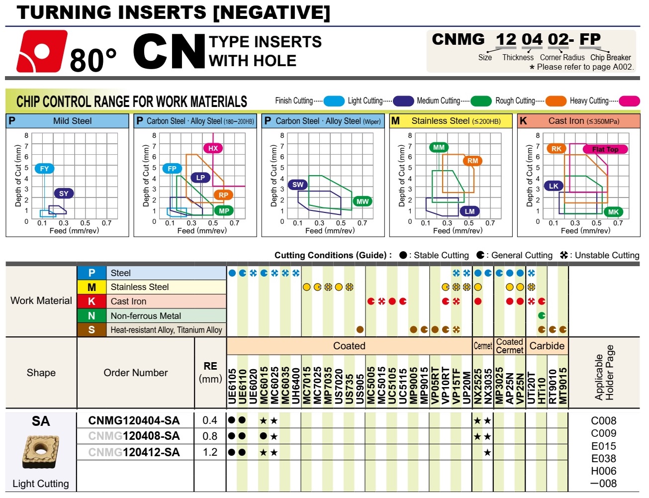 CNMG120404-SA UE6105, CNMG120404-SA UE6110, CNMG120404-SA MC6015, CNMG120404-SA MC6025, CNMG120404-SA NX2525, CNMG120404-SA NX3035, CNMG120408-SA UE6105, CNMG120408-SA UE6110, CNMG120408-SA MC6015, CNMG120408-SA MC6025, CNMG120408-SA NX2525, CNMG120408-SA NX3035, CNMG120412-SA UE6105, CNMG120412-SA UE6110, CNMG120412-SA MC6015, CNMG120412-SA MC6025, CNMG120412-SA NX3035.