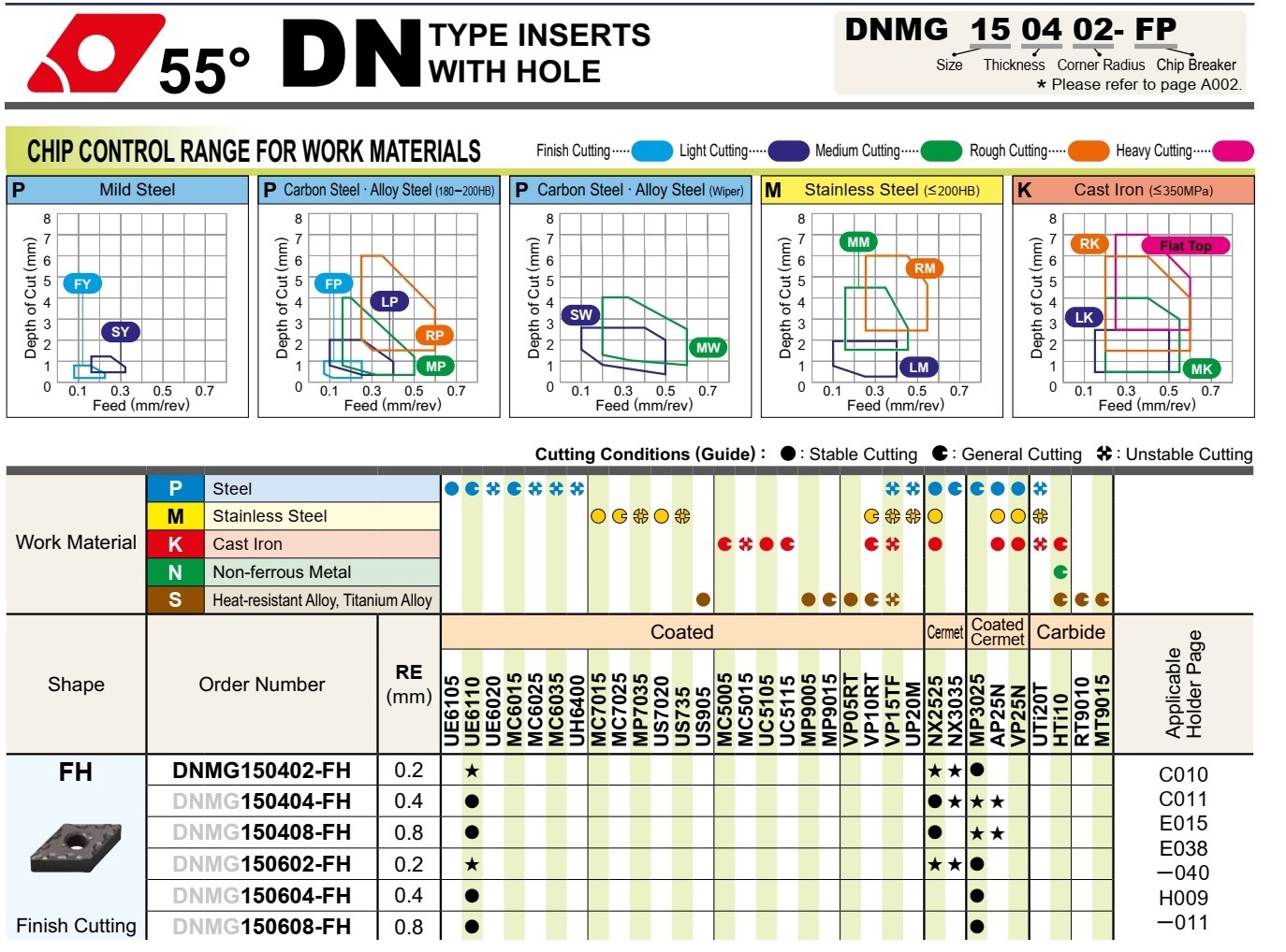 DNMG150402-FH UE6110, DNMG150402-FH NX2525, DNMG150402-FH NX3035, DNMG150402-FH MP3025, DNMG150404-FH UE6110, DNMG150404-FH NX2525, DNMG150404-FH NX3035, DNMG150404-FH MP3025, DNMG150404-FH AP25N, DNMG150408-FH UE6110, DNMG150408-FH NX2525, DNMG150408-FH MP3025, DNMG150408-FH AP25N, DNMG150602-FH UE6110, DNMG150602-FH NX2525, DNMG150602-FH NX3035, DNMG150602-FH MP3025, DNMG150604-FH UE6110, DNMG150604-FH MP3025, DNMG150608-FH UE6110, DNMG150608-FH MP3025