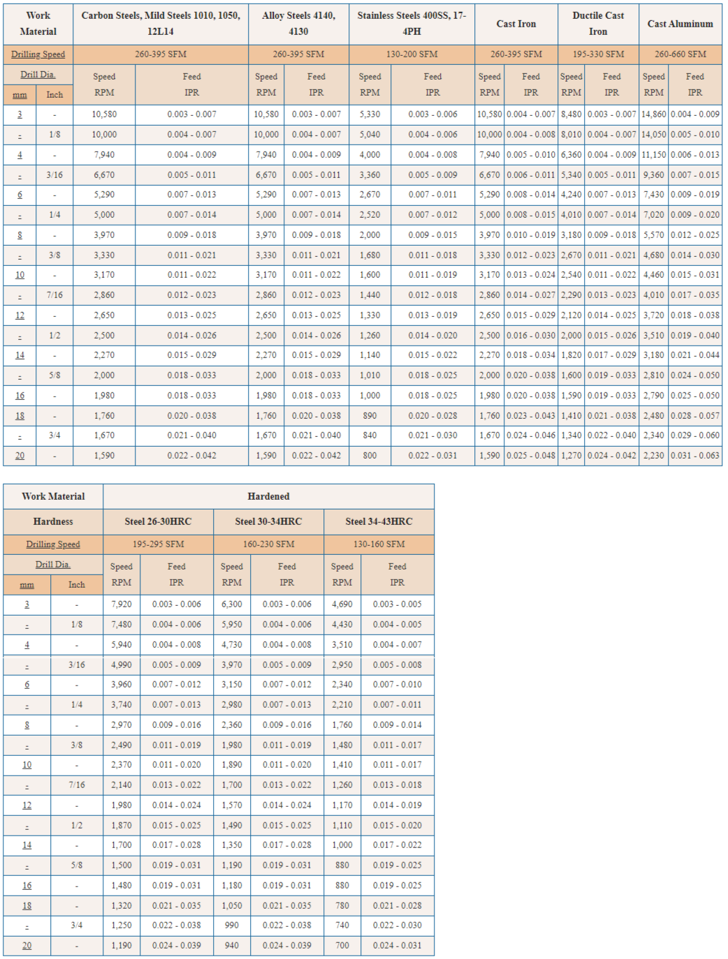 Bảng tính tốc độ và bước tiến dao