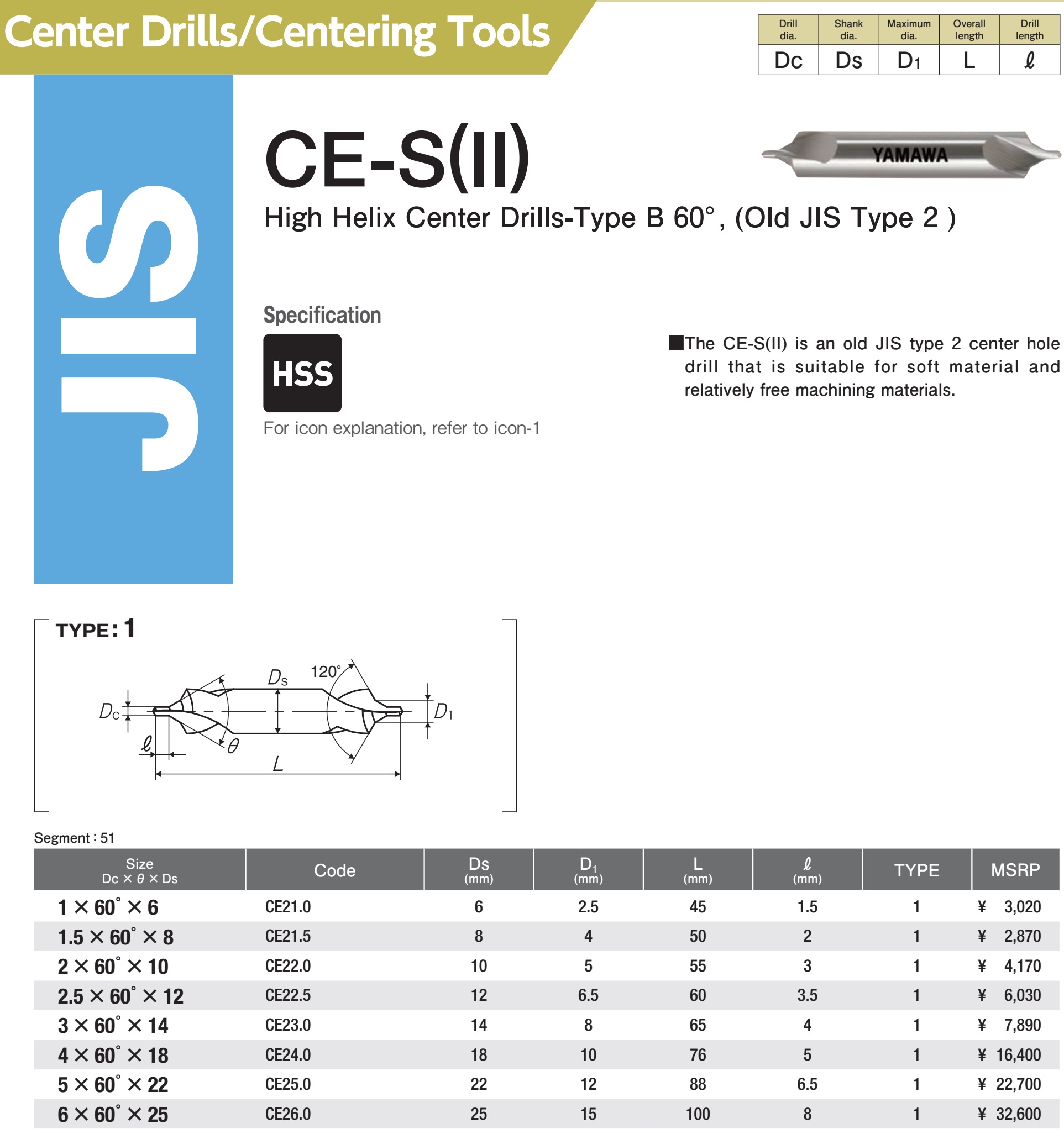 Bảng giá Mũi khoan tâm Yamawa CE-S (II) kiểu B 60 độ chuẩn Old JIS Type 2: