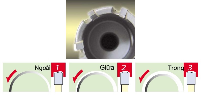 Là mũi khoan 3 cặp lưỡi cắt gồm lưỡi cắt phía ngoài, lưỡi cắt giữa và lưỡi cắt trong. Và với việc cắt lần lượt 1/3 độ rộng bề mặt, nên đã giảm được tối đa các góc phoi. Do có lưỡi cắt phía mặt trong nên dễ dàng đẩy phoi ra ngoài.