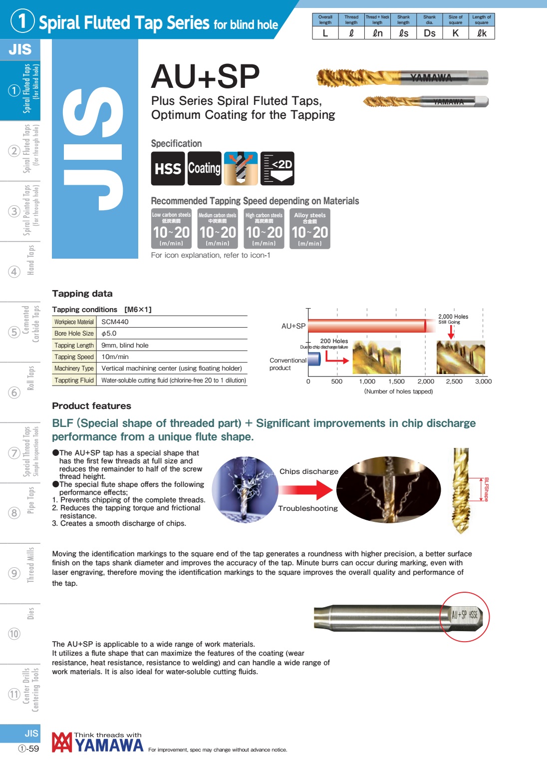 Mũi taro xoắn hiệu suất cao AU+SP phủ TiN YAMAWA (Plus Series Spiral Fluted Taps, Optimum Coating for Tap) nhờ tối ưu hóa thông số cắt và lớp phủ cho taro làm cho tuổi thọ của mũi taro lâu hơn, cải thiện tốc độ taro làm tăng năng suất.