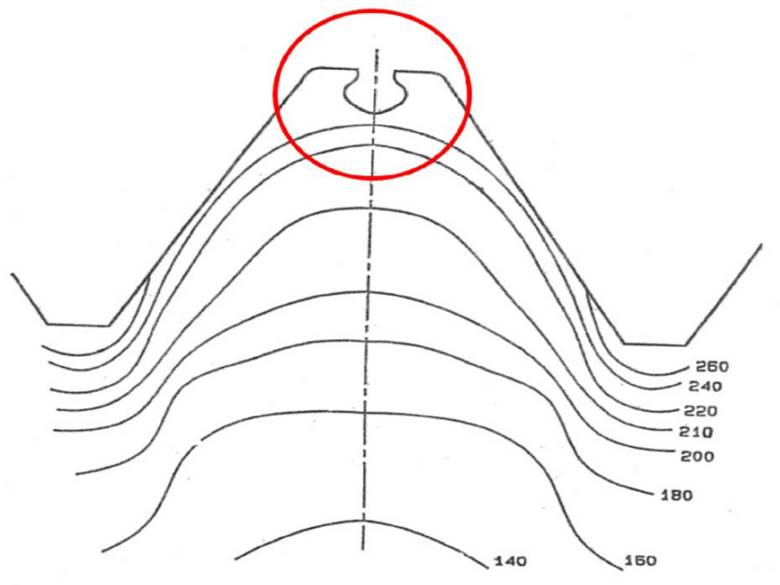 - Trên đường chân ren của ren trong có thể thấy hình chữ U trên đỉnh ren. Đây là hình dạng ban đầu thường thấy ở ép ren và không xuất hiện khi cắt ren bằng mũi taro cắt.