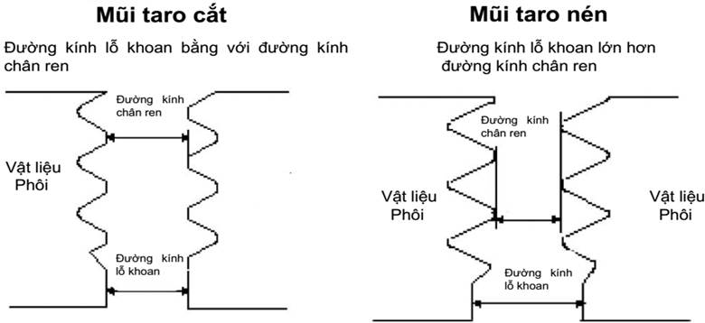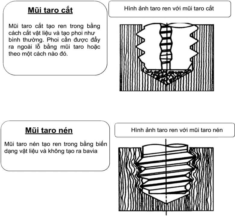 Sự khác biệt cơ bản giữa mũi taro cắt và mũi taro nén là mũi taro cắt đẩy phoi ra khỏi lỗ, còn mũi taro nén tạo ren bằng biến dạng vật liệu và không tạo ra phoi. Hình ảnh bên dưới cho thấy sự khác biệt giữa 2 loại mũi taro.