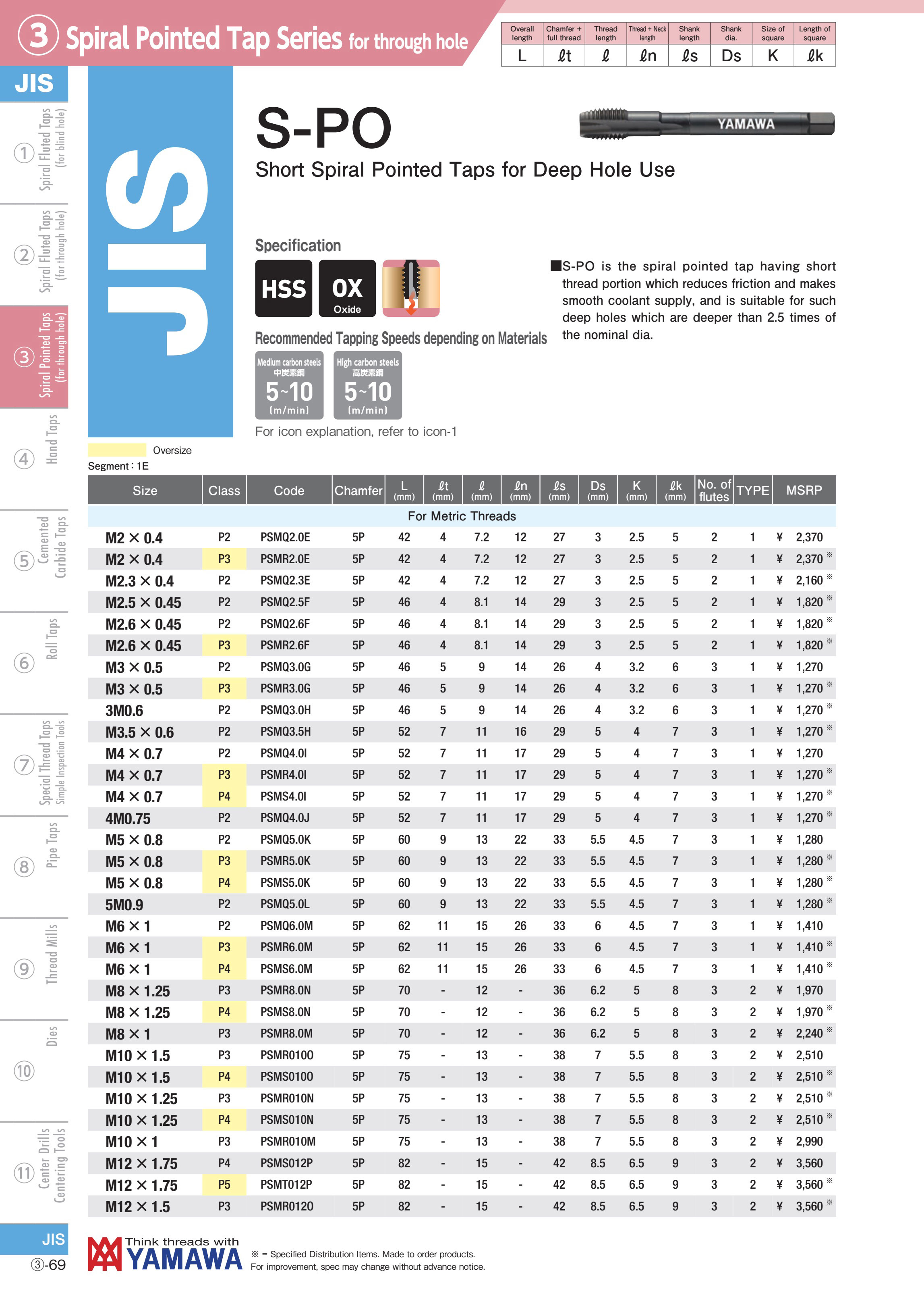 Mũi taro ngắn rãnh thẳng S-PO YAMAWA cho taro lỗ sâu là mũi taro máy rãnh thẳng. Khi taro ren sẽ đẩy phoi xuống phía dưới do đó nó sử dụng để taro lỗ thông. Một số chi tiết máy có lỗ ren nằm phía dưới đáy do đó mũi khoan dài được sử dụng.