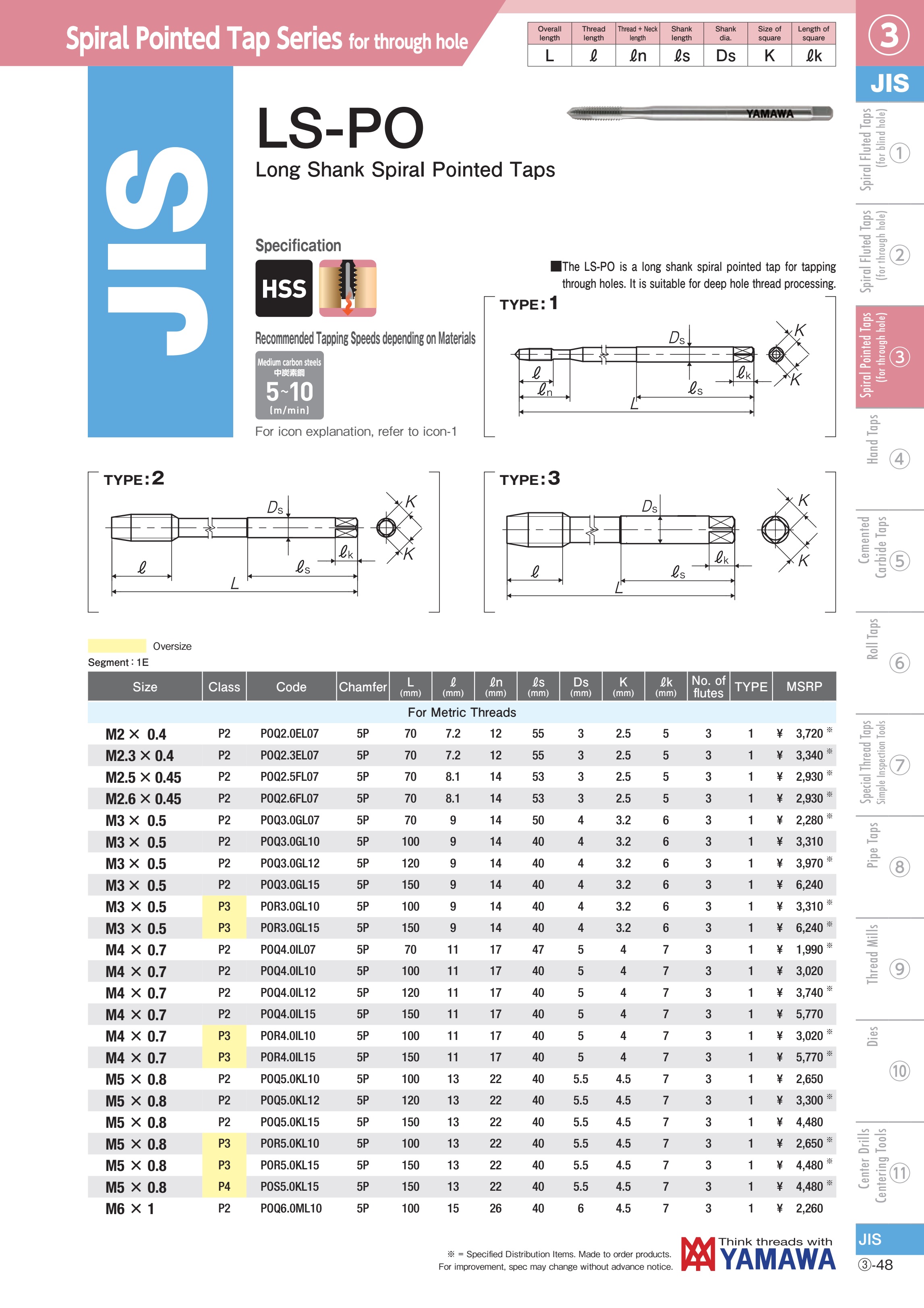 Mũi taro rãnh thẳng dài LS-PO YAMAWA là mũi taro máy rãnh thẳng. Khi taro ren sẽ đẩy phoi xuống phía dưới do đó nó sử dụng để taro lỗ thông. Một số chi tiết máy có lỗ ren nằm phía dưới đáy do đó mũi khoan dài được sử dụng.