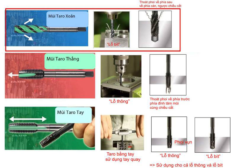 ※ Đôi khi mũi taro xoắn có thể gặp các vấn đề về hiệu suất do phoi gây ra khi taro các vật liệu quá mềm hoặc vật liệu có phoi vụn hoặc ngắn.