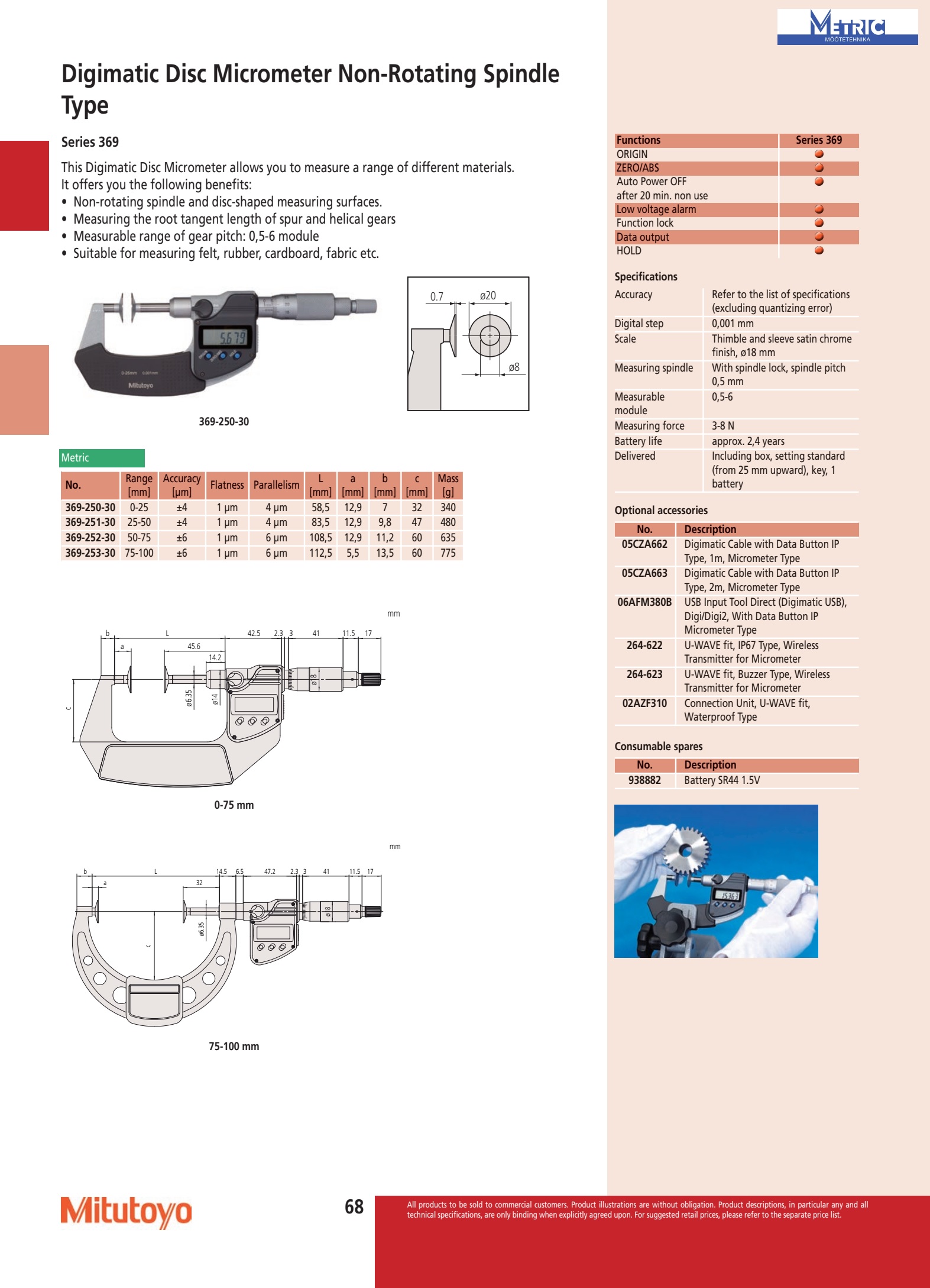 Mitutoyo, được thành lập vào ngày 22 tháng 10 năm 1934 được thành lập bởi Yehan Numata (沼 田 恵 範 Numata Ehan) với một sản phẩm, thước đo micromet. Triết lý của Mitutoyo lúc đó là sản xuất thước đo micromet chất lượng cao, nhưng cũng để sản xuất chúng với số lượng đủ để mang đến giá cả phải chăng và có sẵn cho tất cả các sản xuất. Triết lý này đã được mở rộng trong vài thập kỷ tiếp theo để đưa ra phạm vi sản phẩm rộng hơn tập trung vào các sản phẩm cơ khí, thước đo kích thước, chẳng hạn như kẹp, chỉ số vòng và các dụng cụ đo khác.