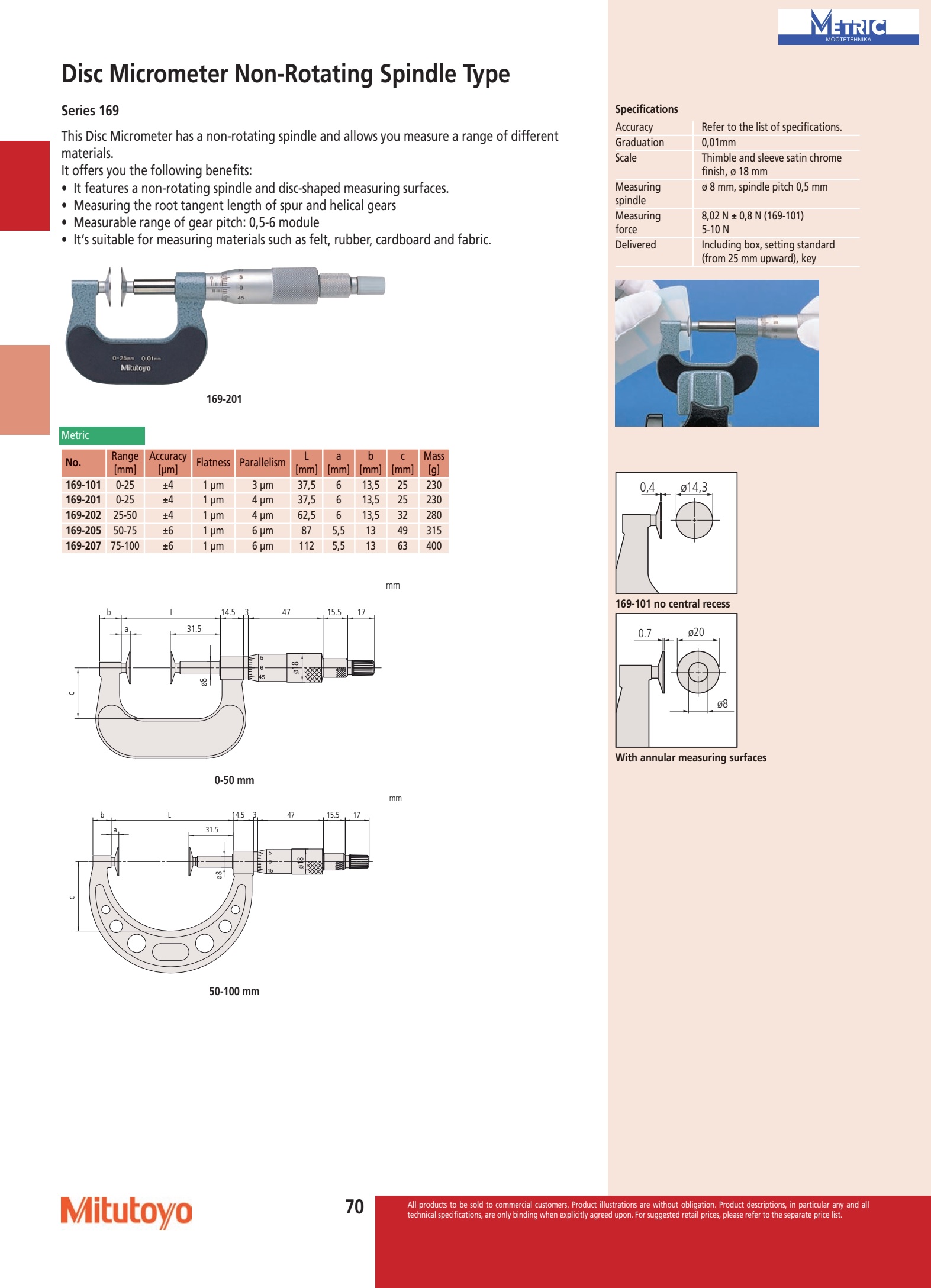 Mitutoyo, được thành lập vào ngày 22 tháng 10 năm 1934 được thành lập bởi Yehan Numata (沼 田 恵 範 Numata Ehan) với một sản phẩm, thước đo micromet. Triết lý của Mitutoyo lúc đó là sản xuất thước đo micromet chất lượng cao, nhưng cũng để sản xuất chúng với số lượng đủ để mang đến giá cả phải chăng và có sẵn cho tất cả các sản xuất. Triết lý này đã được mở rộng trong vài thập kỷ tiếp theo để đưa ra phạm vi sản phẩm rộng hơn tập trung vào các sản phẩm cơ khí, thước đo kích thước, chẳng hạn như kẹp, chỉ số vòng và các dụng cụ đo khác.