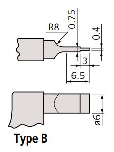 Đầu đo cố định (anvil) và đầu đo di động (spindle) dạng dẹp, để đo đường kính rãnh của trục, rãnh then, hoặc các vị trí khó tiếp cận.