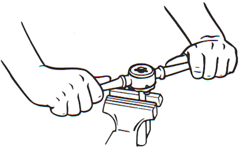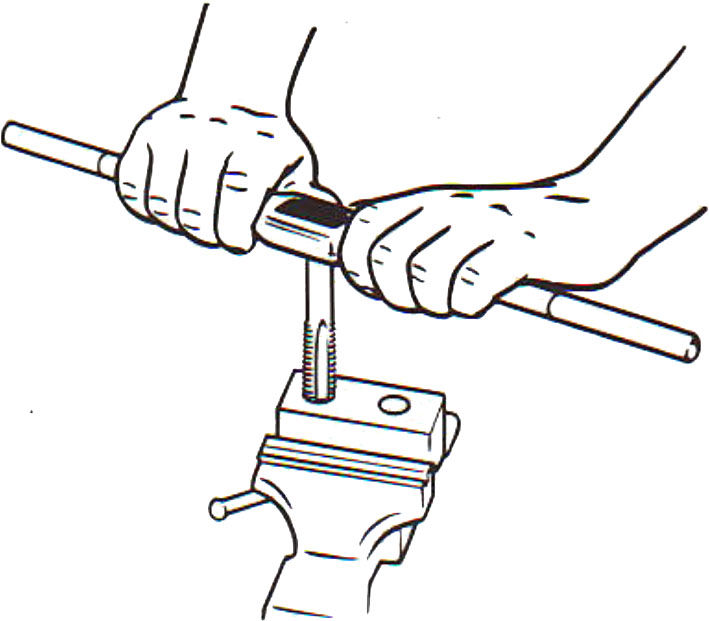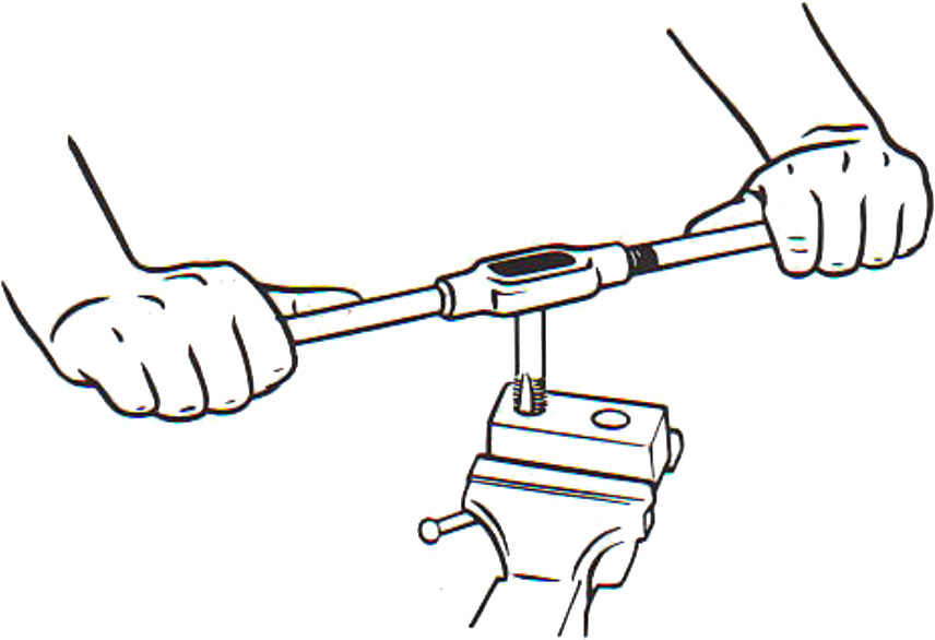Khi ren được bắt đầu đúng cách, mũi taro sẽ tự cuốn vào phôi. Không cần phải ấn xuống nữa. Cầm tay quay taro ở hai đầu cuối tay cầm và từ từ tiếp tục cắt ren vào lỗ. Nếu thấy kẹt, quay mũi taro theo chiều ngược lại để làm vỡ phoi. Đừng cố cắt ren.